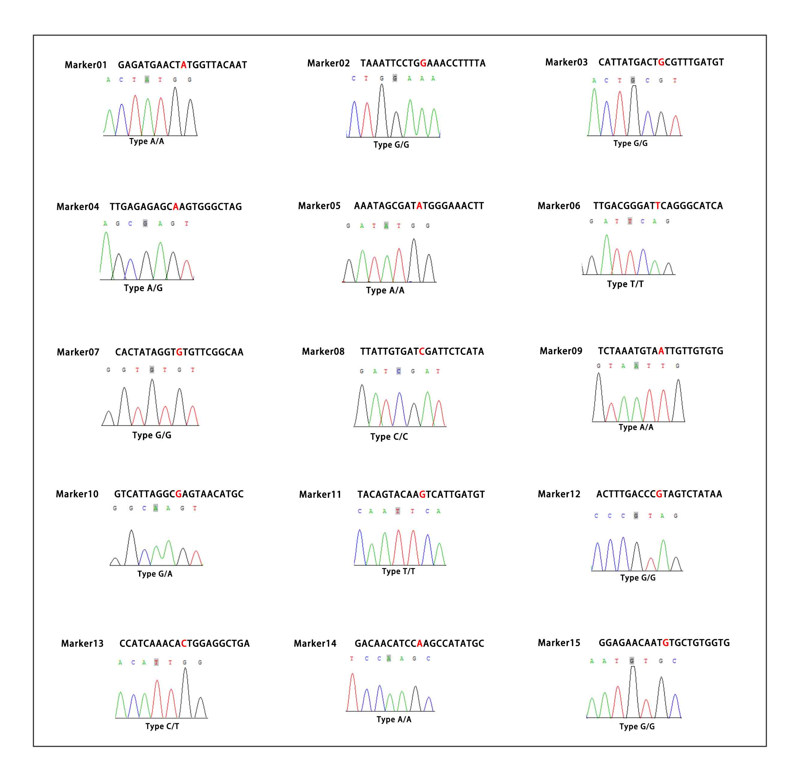 Primers for the 15 SNP loci were designed using Primer Premier 5 software (Table 2), and the DNA of the validation test sample was extracted to conduct PCR. The parameters were set as follows: length, 18–30 bp; Tm value, 55–65 degrees; and GC content, 40%–70%. The primers were synthesized by Sangon Bioengineering Co., Ltd. (Shanghai, China). Four samples were randomly selected from 39 known samples, and three unknown samples were added (Table 1). A total of seven verification DNA samples were selected as templates for PCR amplification. The total volume of the PCR mixture was 25 μl, containing 1 μl DNA template (100 ng/μl), 1 μl each of Primer F and Primer R (10 pmol/L), 0.2 μl Taq Plus DNA polymerase (5 U/μl), 2.5 μl 10× PCR buffer with Mg2+, and 1 μl dNTP (10 mM). The PCR reaction program involved pre-denaturation at 95°C for 5 min, denaturation at 94°C for 30 s, annealing for 30 s to 63°C, and extension at 72°C for a total of 30 s; this was repeated for 30 cycles, after which there was a final extension at 72°C for 10 min before storage at 4°C. After PCR amplification, 5 μl of PCR products were taken and subjected to 1% agarose gel electrophoresis at 150 V and 100 mA. After 10–20 min of observation, the target PCR band was cut from the gel, recovered, and then sequenced using 3730XL. The sequencing data were searched in the results group, and sequence analysis software SnapGene was used for analysis. Finally, SeqMan software was used to observe the peak map to test the reproducibility, genetic stability, and specificity of 15 SNPs.