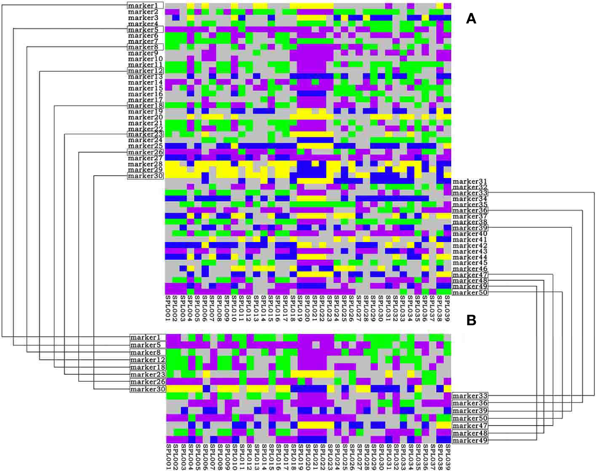DNA fingerprint construction was performed based on the high-quality SNPs obtained (Xu et al., 2017). As few markers as possible were used to identify as many varieties as possible to achieve the purposes of simplicity, efficiency, and economy (Wang et al., 2009). Fifty core markers with a high detection rate and significant amounts of polymorphism that could distinguish all varieties were screened out based on the size of the polymorphic information content (PIC) value and distribution frequency (Pavana et al., 2012), and then a DNA fingerprint was constructed. Furthermore, the 15 leanest SNP combinations were further screened out (Jones and Mackay, 2015) to identify Lonicera varieties with lower costs and faster speeds.
