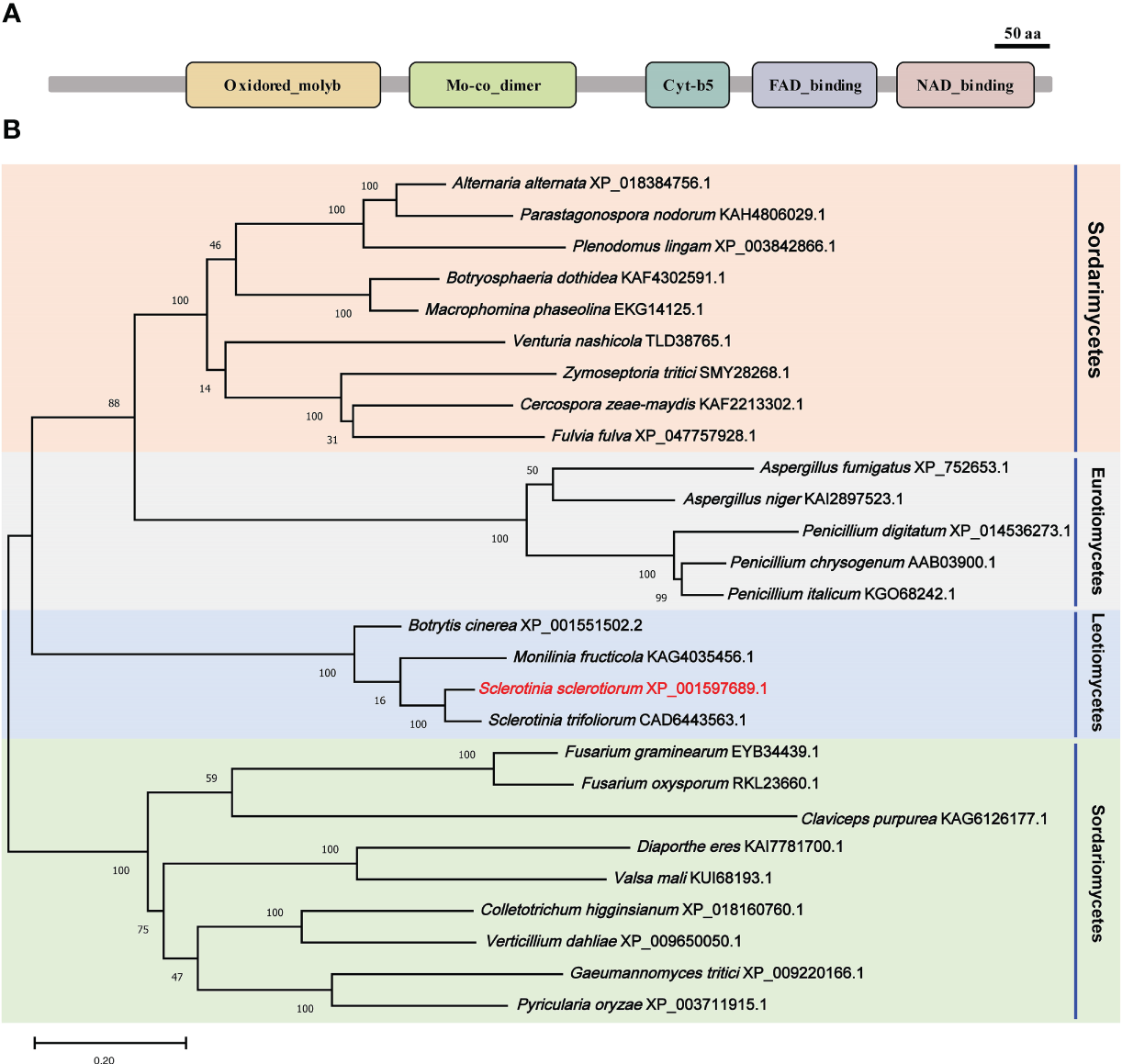 Functional domain identification and phylogenetic tree reconstruction. (A) Functional domains of SsNR were identified by searching SMART containing an Oxidored_molyb, Mo-co_dimer, Cyt-b5 domain, FAD_binding_6 domain, and NAD_binding_1. (B) Phylogenetic tree reconstructed using the maximum likelihood (ML) method with 1,000 bootstraps.