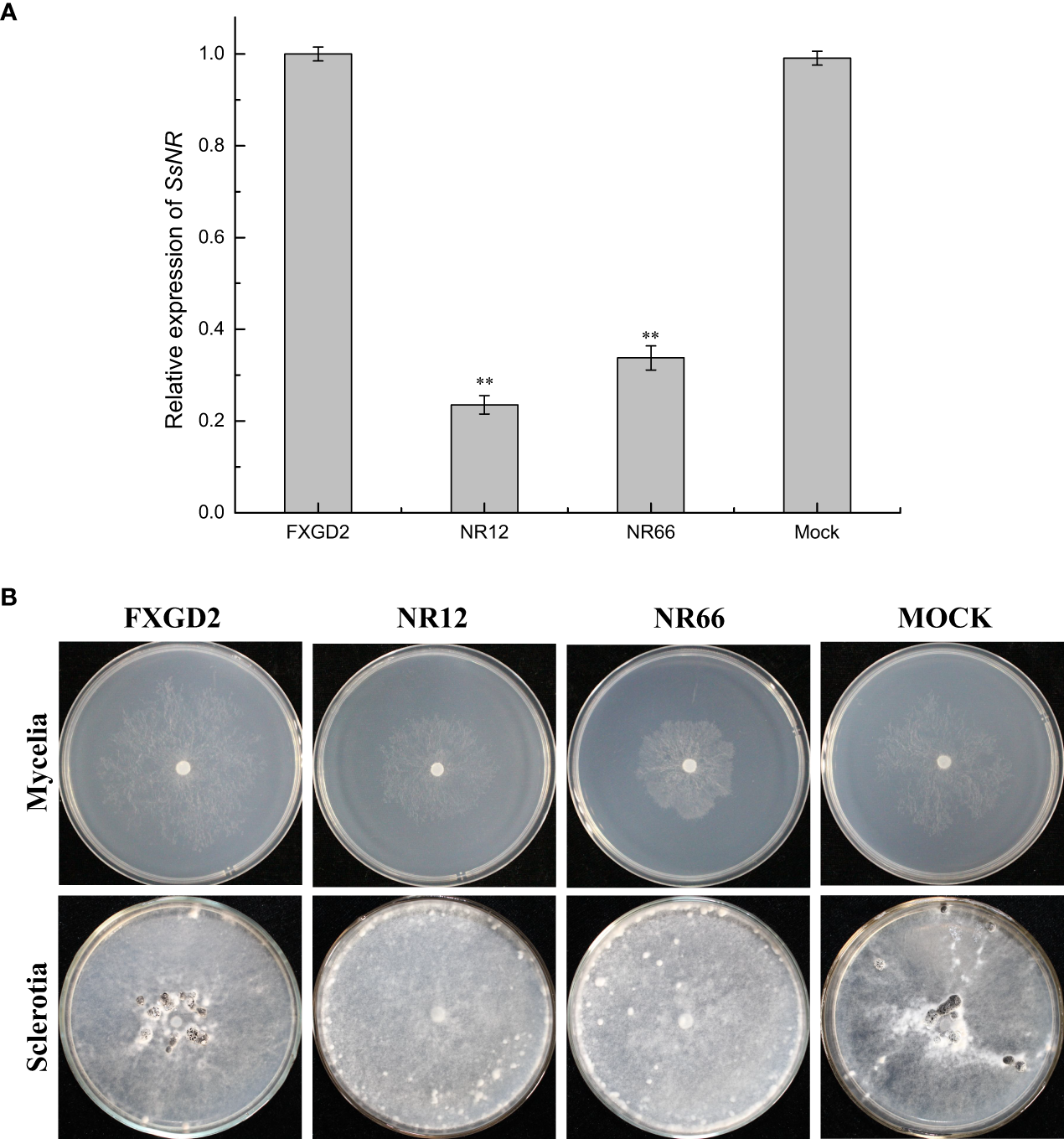 SsNR-silenced impaired hyphae growth and sclerotia development. (A) qRT-PCR analysis of the expression of SsNR in WT, SsNR-silenced mutants and mock. Statistical significance is indicated: **, P < 0.01. (B) Colony morphology of WT, SsNR-silenced mutants and mock cultured on PDA at 25°C. Photos were taken at 2 dpi, and the sclerotia of WT, SsNR-silenced mutants and mock cultured on PDA at 25°C. Photos were taken at 10 dpi.