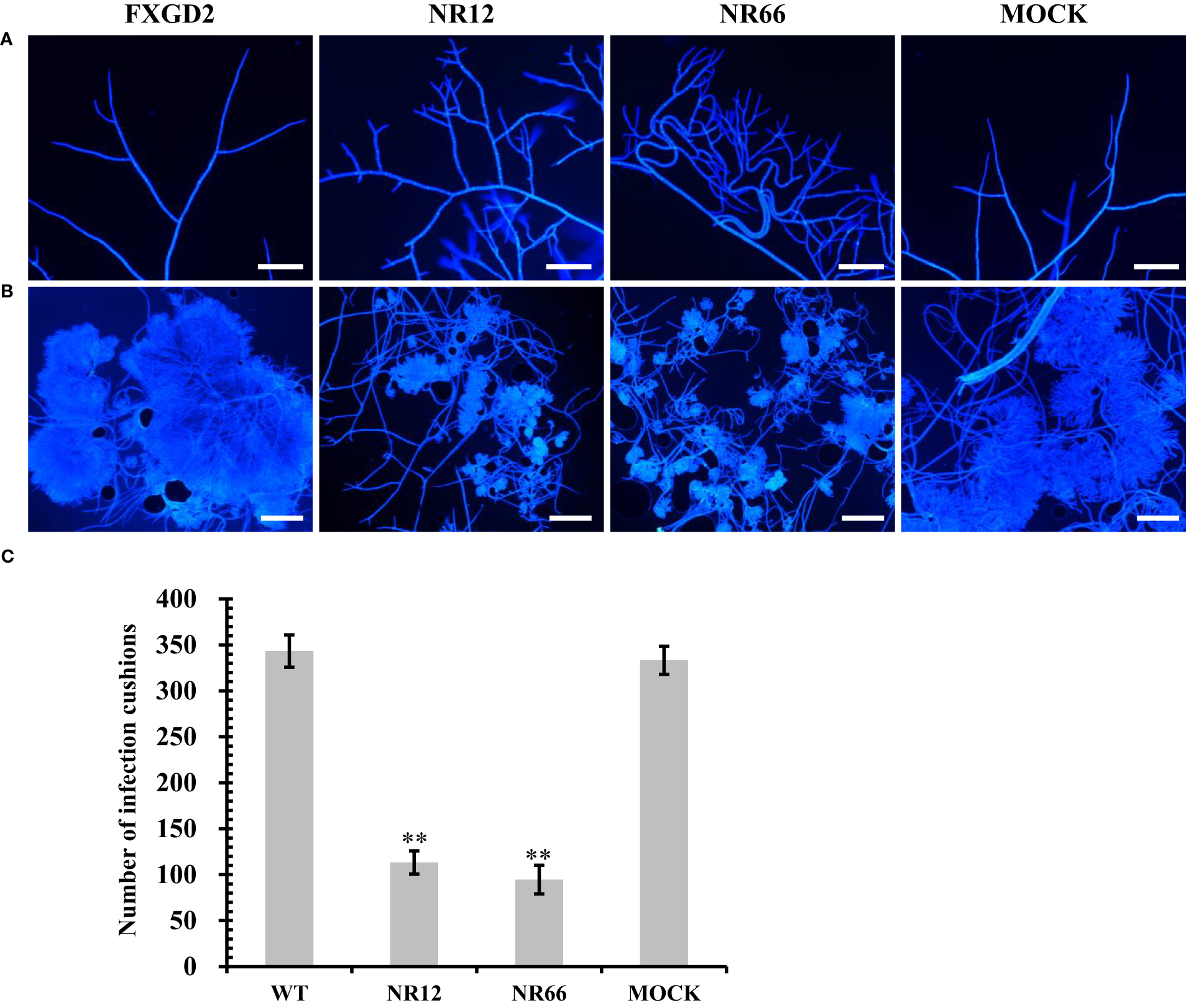 Mycelial growth and infection cushion formation of SsNR-silenced mutants. (A) Hyphal branching and tips stained of all strains were observed under a light microscope. (B) Infection cushions stained of all strains were observed under a light microscope. (C) Number of infection cushion produced by all strains. Bar = 100 μm, hyphae and infection cushions were by Calcofluor white (CFW) (10 μg/mL). Statistical significance is indicated: **, P < 0.01.
