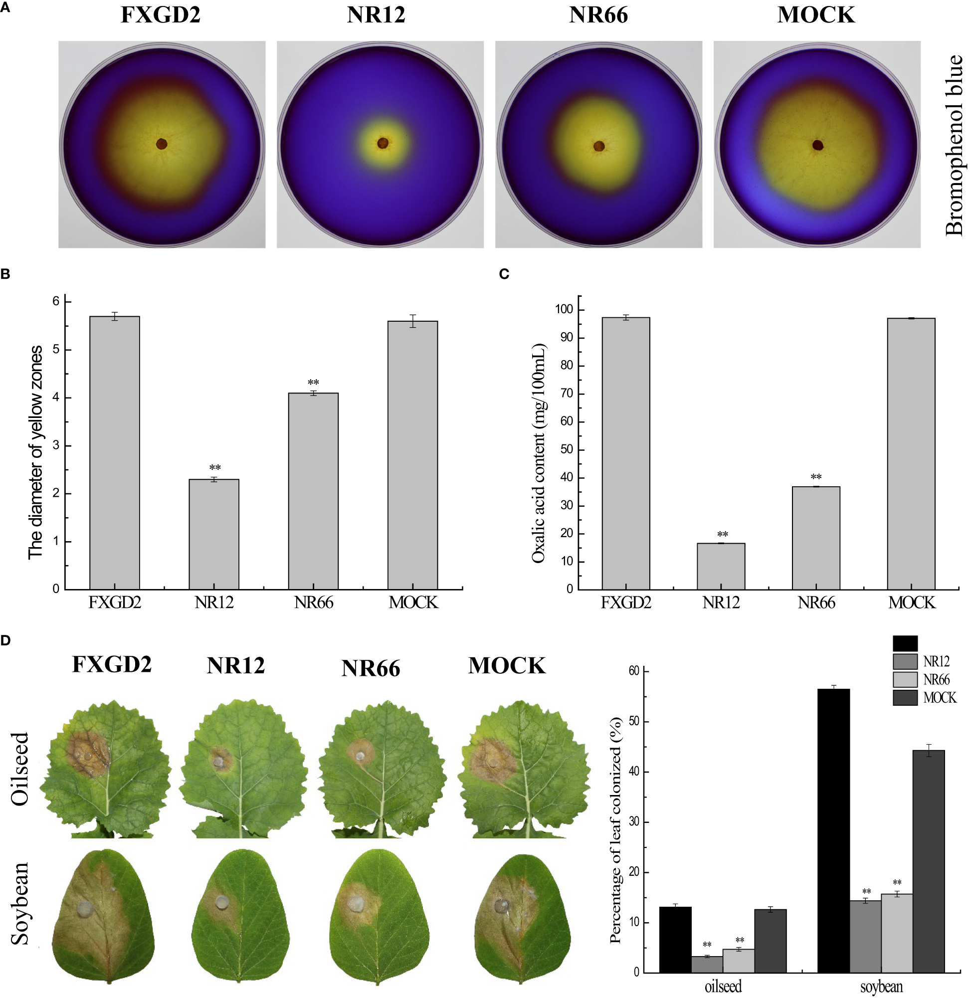 Strains were cultured on MM medium containing 0.01% bromophenol blue for qualitative analysis of oxalic acid production. For quantification of oxalic acid, mycelium plugs of different strains were cultured in 100 mL YSPU medium at 25°C for 5 days, and the content of oxalic acid secreted in YSPU was measured by KMnO4 titration method (Baker, 1952). This experiment was repeated three times.