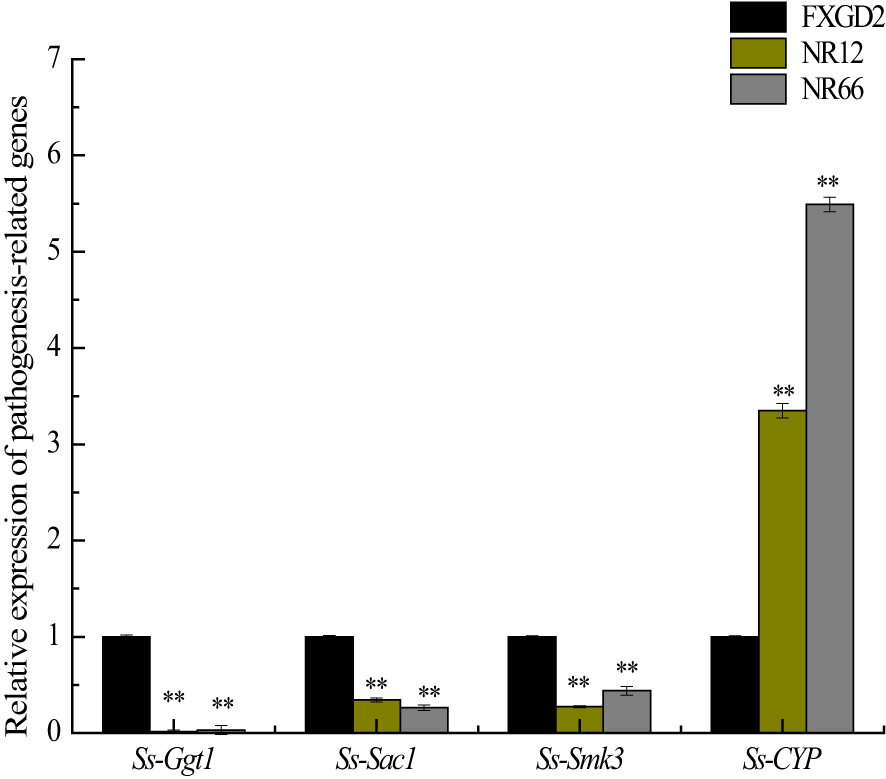To investigate whether SsNR-silencing affects the transcriptional expression levels of other pathogenicity-related genes, Ggt1, Sac1, Smk3, and CYP, were analyzed by qRT-PCR. The results showed that the expression levels of Ggt1, Sac1, and Smk3 in SsNR-silenced mutants were decreased by 96%~98%, 65%~74%, and 56%~72%, respectively. At the same time, the expression level of CYP was increased by 230%~440% (Figure 7).