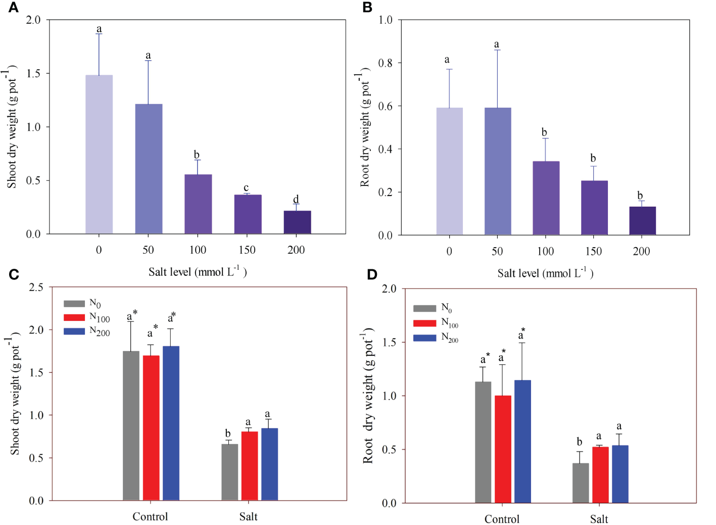 Alfalfa shoot (A) and root (B) dry weight in different salt levels in experiment 1. Alfalfa shoot (C) and root (D) dry weight in different nitrogen (N) supply and salt levels in experiment 2. Error bars represent ± SD of the mean. Different letters represent a significant difference among treatments (p ≤ 0.05). Asterisks refer to significant differences between salt levels at the same N fertilizer supply rates.