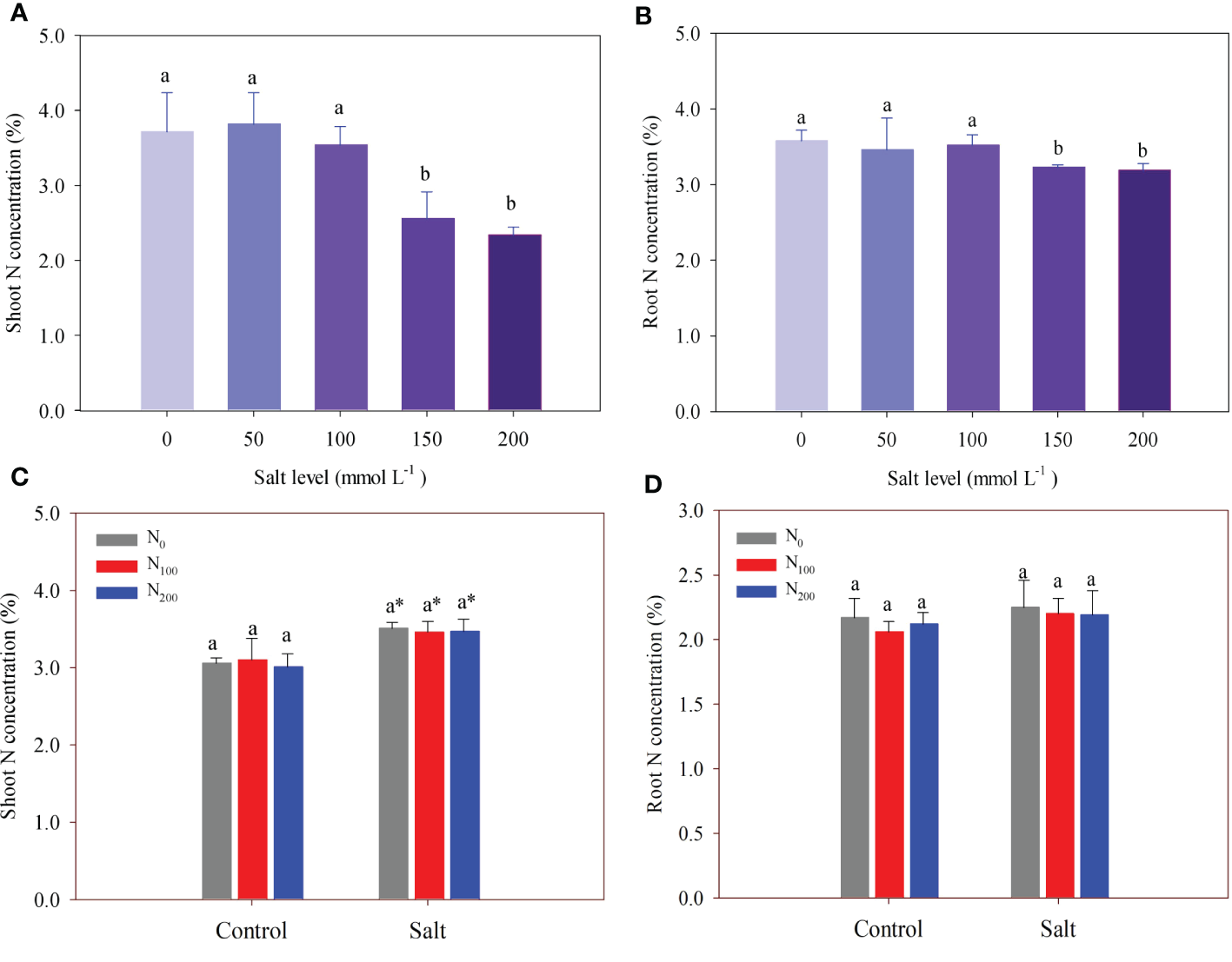 Alfalfa shoot (A) and root (B) nitrogen (N) concentration in different salt levels in experiment 1. Alfalfa shoot (C) and root (D) N concentration in different N supply and salt levels in experiment 2. Error bars represent ± SD of the mean. Different letters represent a significant difference among treatments (p ≤ 0.05). Asterisks refer to significant differences between salt levels at the same N fertilizer supply rates.