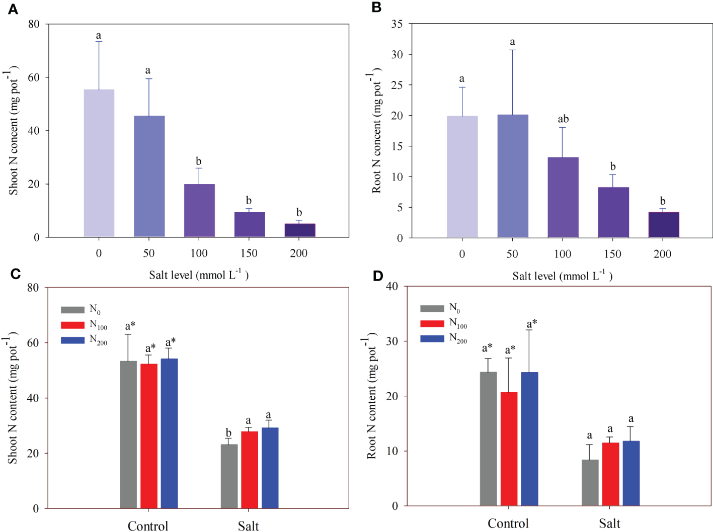 Alfalfa shoot (A) and root (B) nitrogen (N) content in different salt levels in experiment 1. Alfalfa shoot (C) and root (D) N content in different N supply and salt levels in experiment 2. Error bars represent ± SD of the mean. Different letters represent a significant difference among treatments (p ≤ 0.05). Asterisks refer to significant differences between salt levels at the same N fertilizer supply rates.