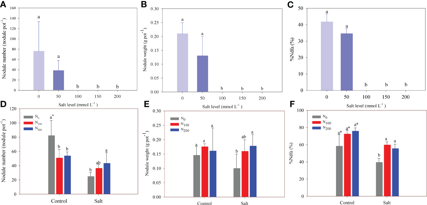 Alfalfa nodule number (A), nodule weight (B), and nitrogen derived from the atmosphere (%Ndfa) (C) in different salt levels in experiment 1. Alfalfa nodule number (D), nodule weight (E), and %Ndfa (F) in different nitrogen (N) supply and salt levels in experiment 2. Error bars represent ± SD of the mean. Different letters represent a significant difference among treatments (p ≤ 0.05). Asterisks refer to significant differences between salt levels at the same N fertilizer supply rates.
