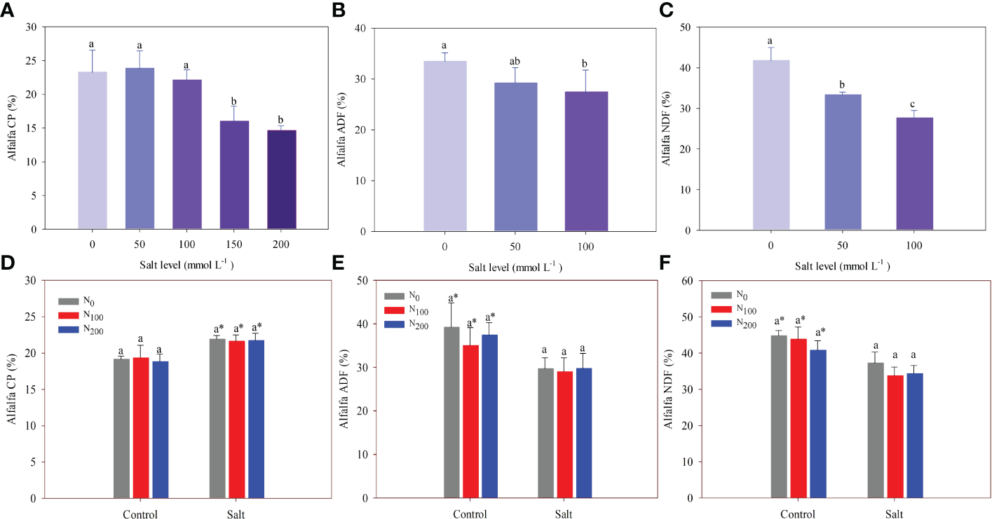 Alfalfa crude protein (CP) (A), acid detergent fiber (ADF) (B), and neutral detergent fiber (NDF) (C) in different salt levels in experiment 1. Incomplete ADF and NDF data owing to insufficient sample weight (shoot dry weight). Alfalfa CP (D), ADF (E), and NDF (F) in different nitrogen (N) supply and salt levels in experiment 2. Error bars represent ± SD of the mean. Different letters represent a significant difference among treatments (p ≤ 0.05). Asterisks refer to significant differences between salt levels at the same N fertilizer supply rates.