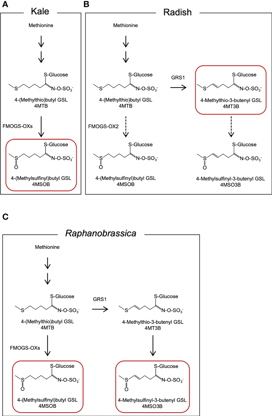 Presumed metabolic pathway of aliphatic GSLs in (A) kale, (B) radish, and (C)Raphanobrassica leaves. GSL, glucosinolate. The GSLs indicated by red boxes are the major GSLs in each species.