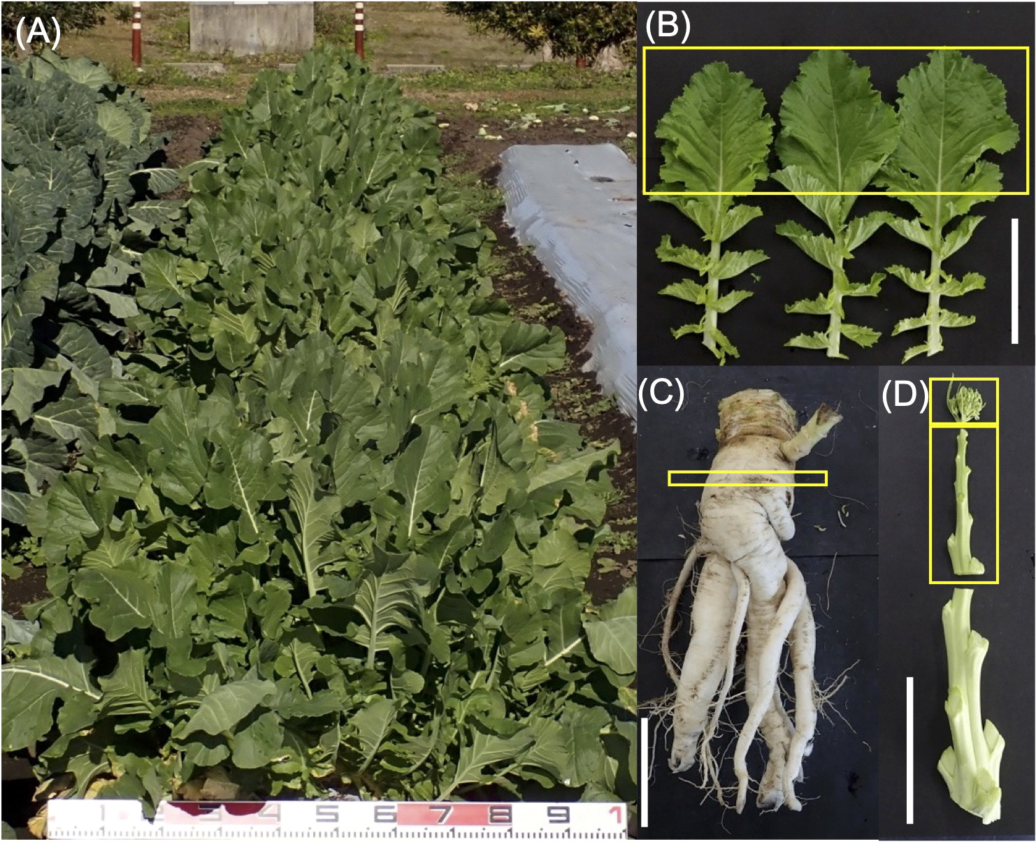 (A) Typical phenotypic characteristics of Raphanobrassica(A). Plant parts used for glucosinolate analysis: (B) leaf, (C) root, (D) flower bud, and stem. Yellow boxes show a part used for high-performance liquid chromatography analysis. White bars indicate 10 cm.