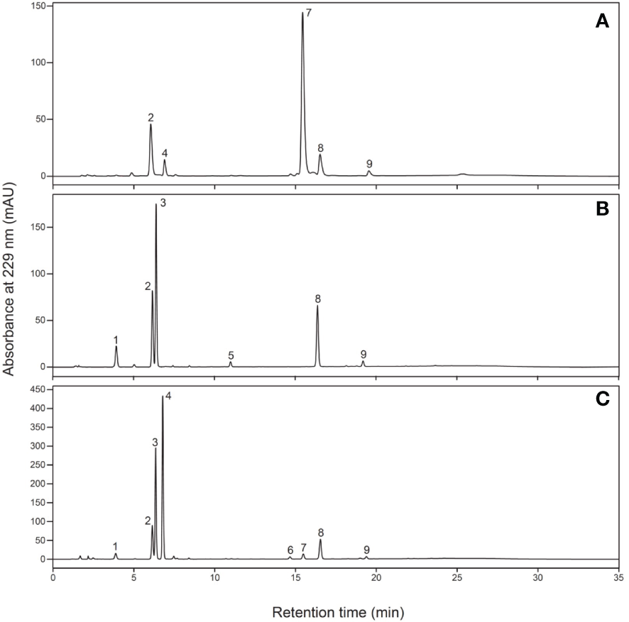 Typical chromatograms of desulfo-glucosinolates in (A) radish, (B) kale, and (C)Raphanobrassica. Peak 1, 3-(methylthio)propyl; peak 2, 2-propenyl (internal standard); peak 3, 4-(methylsulfinyl)butyl; peak 4, 4-methylsulfinyl-3-butenyl; peak 5, 4-methoxyindol-3-ylmethyl; peak 6, 4-(methylthio)butyl; peak 7, 4-methylthio-3-butenyl; peak 8, indol-3-ylmethyl; peak 9, 4-methoxyindol-3-ylmethyl.