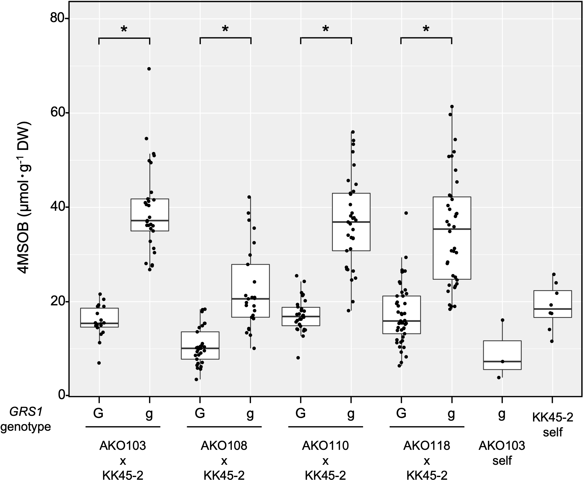 | Cross combination | GRS1 genotype | Number of plants | µmol·g-1 dry weight | 4MSOB ratioa | |