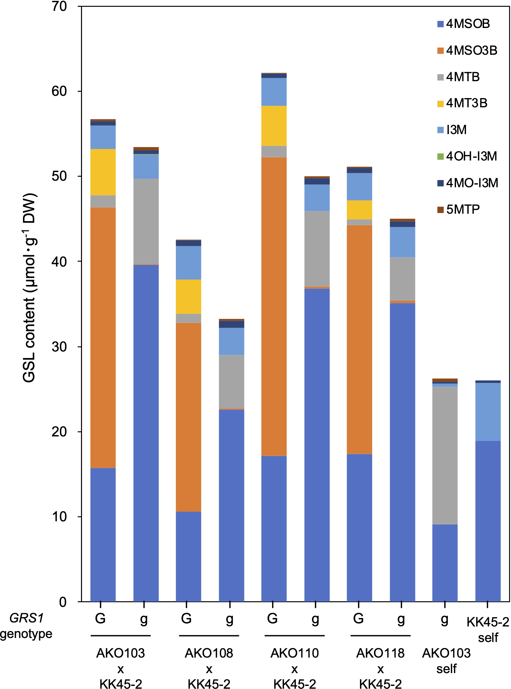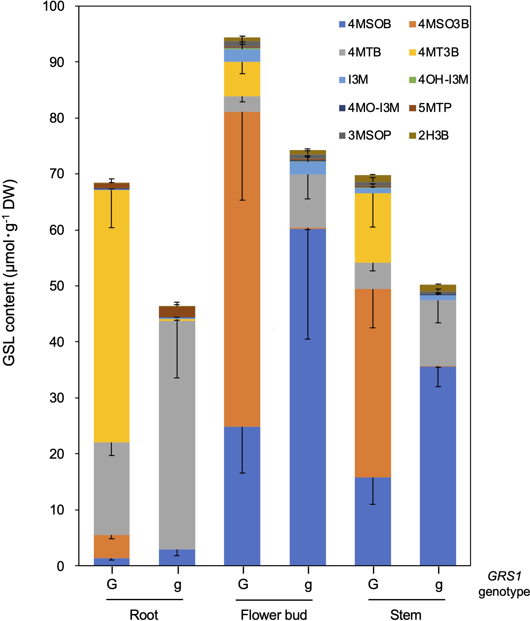 GSL composition and content in Raphanobrassica leaf. The genotype of GRS1 is indicated by “G” for functional and “g” for null allele. GRS1, GLUCORAPHASATIN SYNTHASE 1; GSL, glucosinolate. 4MSOB, 4-(methylsulfinyl)butyl GSL; 4MSO3B, 4-methylsulfinyl-3-butenyl GSL; 4MTB, 4-(methylthio)butyl GSL; 4MT3B, 4-methylthio-3-butenyl GSL; I3M, indol-3-ylmethyl GSL; 4OH-I3M, 4-methoxyindol-3-ylmethyl GSL, 4MO-I3M, 4-methoxyindol-3-ylmethyl GSL; 5MTP, 5-(methylthio)pentyl GSL.