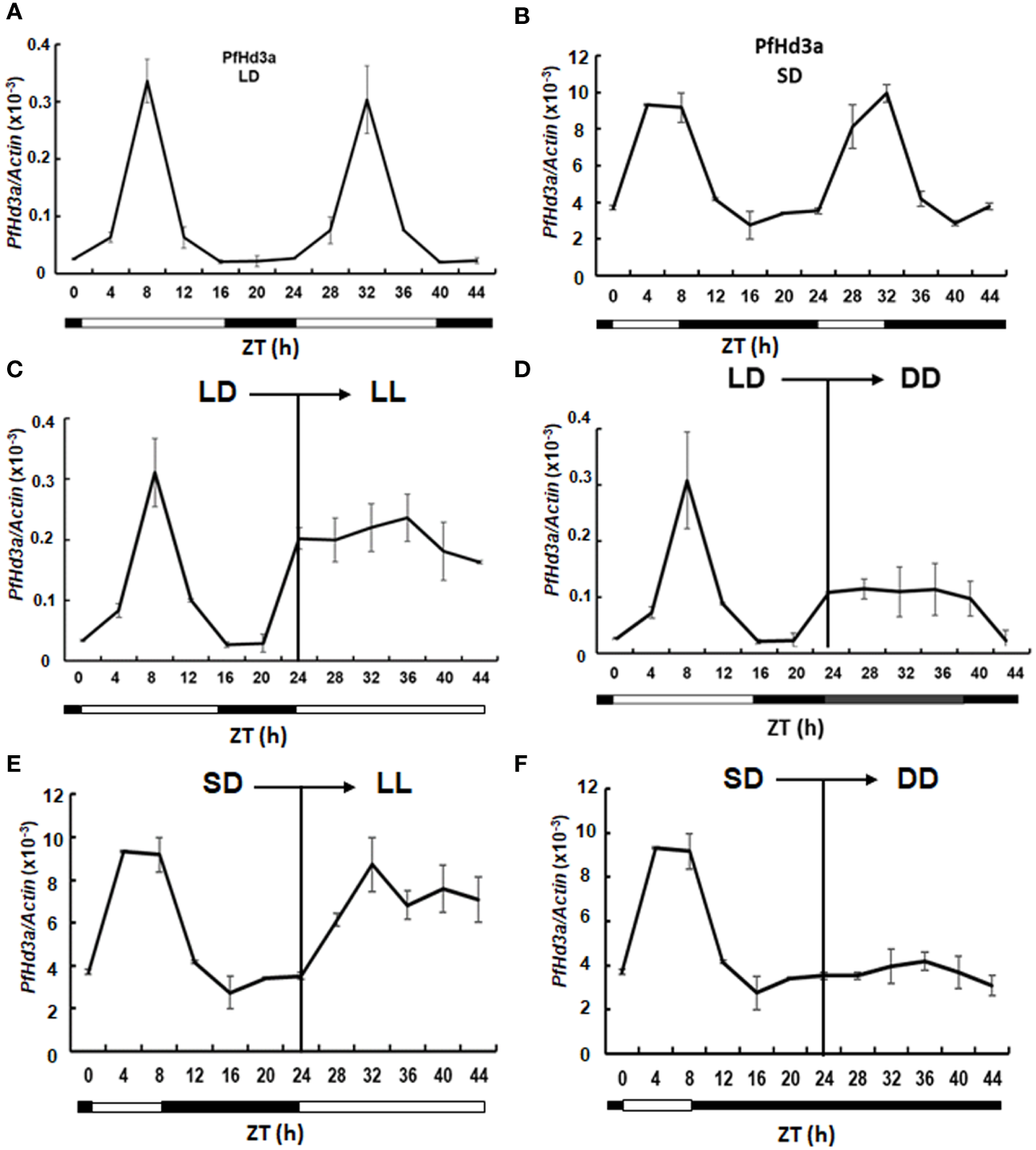 Expression analysis of PfHd3a. Rhythmic expression of PfHd3a under LD (A) and SD (B). Expression analysis of PfHd3a under continuous light (LL) continuous dark (DD). The perillas were grown in growth chambers under LD (16 h light/8 darkness) and then transferred to LL (C) or DD (D) conditions. The perillas were grown in growth chambers under SD (8 h light/16 darkness) and then transferred to LL (E) or DD (F) conditions. White bars indicated light; black bars indicate darkness. The perilla actin gene was used as the internal control. Values represent means ± Standard deviation (SD) from two independent biological replicates.