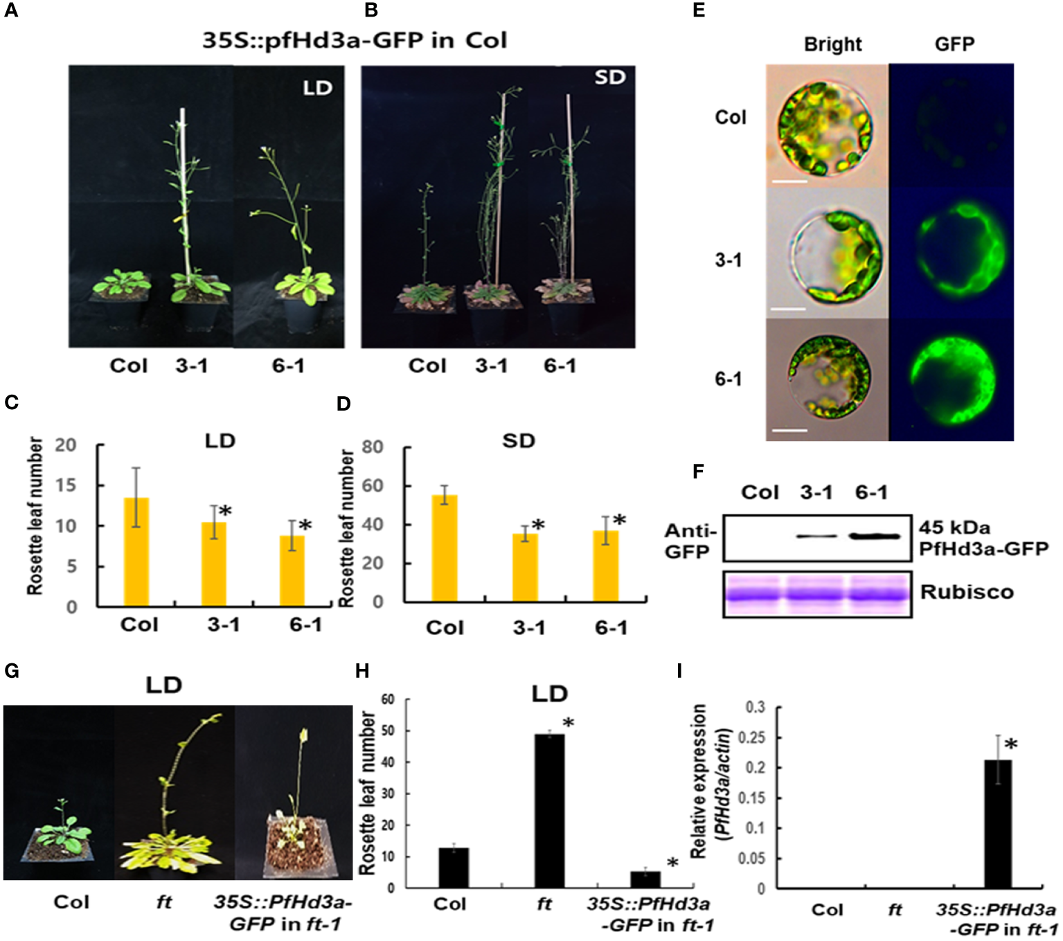 Flowering phenotype of overexpressed PfHd3a in Arabidopsis. Early flowering of 35S:PfHd3a-GFP in LD (A) and SD (B). Flowering times were determined at total rosette leaf number at the time of flowering under LD (C) and SD (D). At least 12 plants of each genotype were used. Statistical significance was determined by Student’s test (*P < 0.001) versus Col. (E) Arabidopsis mesophyll protoplasts were extracted from each genotype and the localization of PfHd3a-GFPs was observed by fluorescence microscopy. Scale bars = 10 μm. (F) Total proteins were extracted from Col and overexpression lines (3-1, 6-1) and then an immune blot was performed with an anti-GFP antibody. Arabidopsis Rubisco proteins were used as a loading control. (G) Complementation analysis of Arabidopsis ft-1 mutant. 35S:PfHd3a-GFP were transformed in Arabidopsis ft mutant and flowering phenotype was observed. (H) Flowering times were determined at the total rosette leaf number at the time of flowering under LD. At least 12 plants of each genotype were used. Statistical significance was determined by Student’s test (*P < 0.001). (I) The levels of PfHd3a mRNA under LD condition determined by qRT-PCR of Samples from 2-week-old plants. Each bar represents an average of two independent replicate experiments. The error bar indicates the standard deviation. Statistical significance was determined by Student’s test (*P < 0.05).