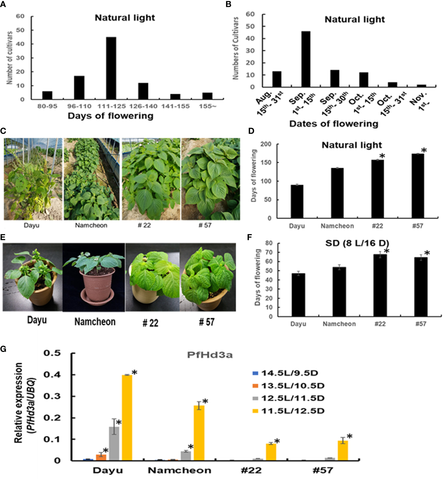 Characteristics of 90 perilla cultivars or perilla genetic resources. (A) The data represent frequency distributions of perilla cultivars based on days of flowering under natural light. (B) The data represent frequency distributions of perilla cultivars based on dates of flowering under natural light. (C) The flowering phenotype of seed perilla Dayu, vegetable perilla Namcheon and two perilla genetic resources #22 and #57 under natural light. (D) Flowering days of Dayu, Namcheon, #22, and #57 under natural light. The error bar indicates the standard deviation. Statistical significance was determined by Student’s test (*P < 0.05). (E) Flowering phenotype of Dayu, Namcheon, #22 and #57 under SD (8 h light/16 h darkness) condition. (F) Flowering days of Dayu, Namcheon, #22, and #57 under SD (8 h light/16 h darkness) condition. Statistical significance was determined by Student’s test (*P < 0.05). (G) The transcript levels of PfHd3a in Dayu, Namcheon, #22 and #57 under different light conditions. QRT-PCR was performed with cDNAs with 30-day-old perillas, dayu, namcheon, #22 and #57 grown in different light conditions. Statistical significance was determined by Student’s test (*P < 0.05).