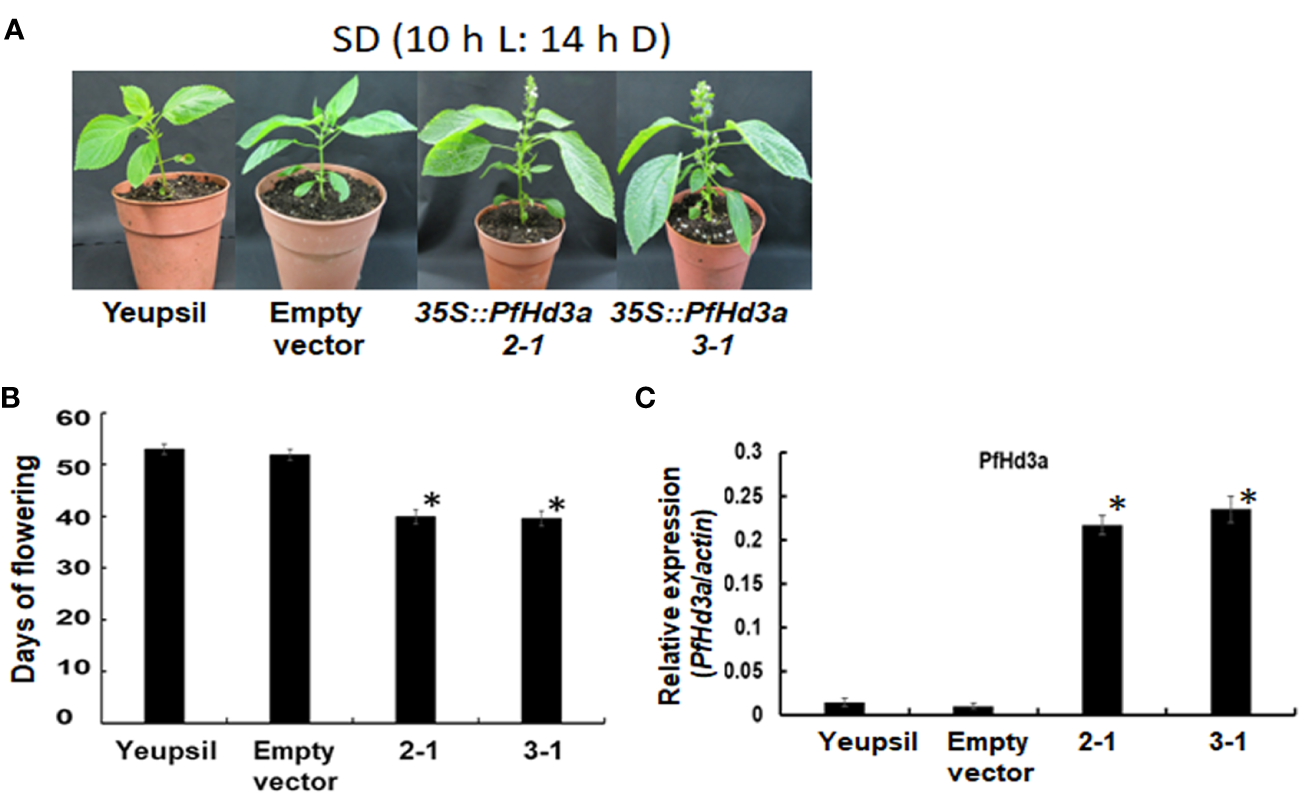 Flowering phenotype of transgenic perillas overexpressing PfHd3a. (A) Early flowering of 35S:PfHd3a 2-1 and 3-1 lines under SD (10 h light/14 h darkness) condition. (B) Flowering times were determined as days of flowering after sowing at the time of flowering under SD (10 h light/14 h darkness) condition. At least 12 plants of each genotype were used. Statistical significance was determined by Student’s test (*P < 0.001). (C) Transcript levels of PfHd3a in transgenic perillas. QRT-PCR was performed with cDNAs with 30-day-old yeopsil, and transgenic perillas (2-1 and 3-1) in SD (10 h light/14 h darkness) condition. Statistical significance was determined by Student’s test (*P < 0.05).