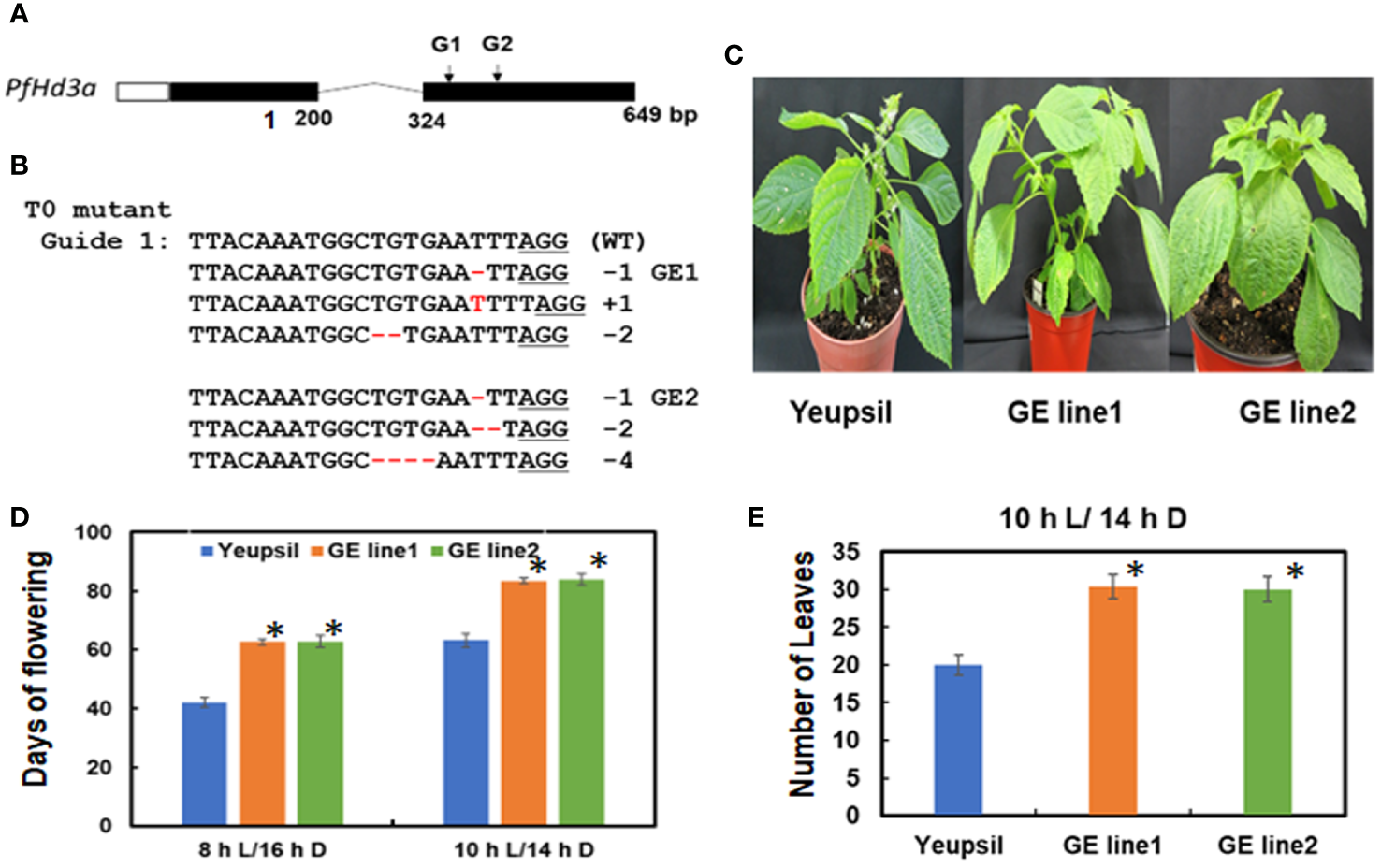 PfHd3a GE perillas enhance leaf productivity. (A) Schematic representation of PfHd3a locus. White, black boxes and curved lines represent 5’-untranslated regions (5’ UTR), coding sequence, and intron, respectively. (B) The aligned NGS reads flaking the PfHd3a target site and numbers represent the number of bases deleted and inserted in the T0 line. (C) The late-flowering phenotype of GE perillas. (D) Flowering times were determined as days of flowering after sowing at the time of flowering under SD (both 8 h light/16 h darkness and 10 h light/14 h darkness) conditions. At least 12 plants of each genotype were used. Statistical significance was determined by Student’s test (*P < 0.001). (E) Number of leaves were counted at the time of flowering under SD (10 h light/14 h darkness) condition. At least 12 plants of each genotype were used. Statistical significance was determined by Student’s test (*P < 0.001).