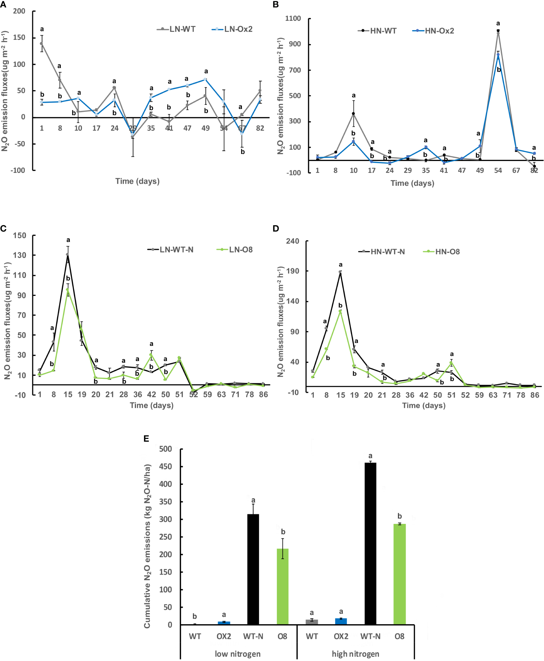 Detailed N2O gas emission fluxes (ugm-2h-1) from rhizosphere of WT, Ox2, WT-N and O8. The (LN) low nitrogen soil application shows in figure (A, C) and (HN) high nitrogen soil application shows in figure (B, D). X-axis shows N2O gas emission recording time (days), from the first measurement after transplanting seedlings from nursery to field is day1 to onwards (A-D). N2O emission flux (ugm-2h-1) from the rhizosphere was compared between Ox2 in figures (A, B) and O8 in figure (C, D) with their respective wildtypes (WT) separately. Figure (E) shows cumulative N2O emission during full growing season (kg N2O-N/ha). Cumulative emission data consist of 13 individual values taken during various growth stages (n=13). Error bars: SE (n = 3 Significant difference between two cultivars (transgenic and respective WT) are indicated by different letters: a= high value, b= lower value (t-test, p< 0.05).