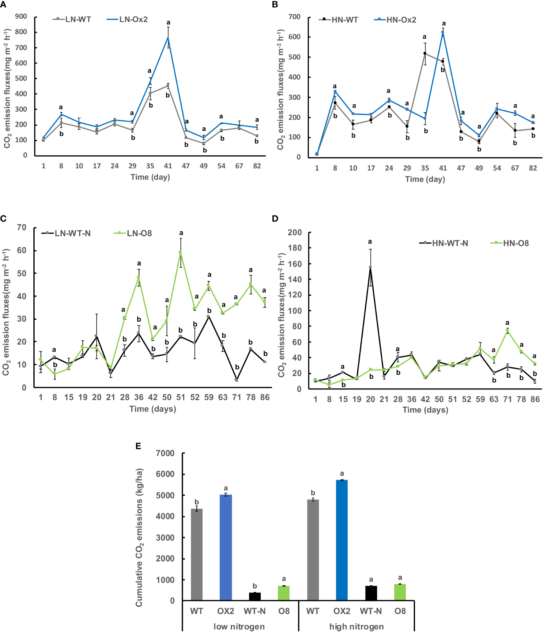 Detailed CO2 gas emission fluxes (mgm-2h-1) from rhizosphere of WT, Ox2, WT-N and O8. The (LN) low nitrogen soil application shows in figure (A, C) and (HN) high nitrogen soil application shows in figure (B, D). X-axis shows CO2 gas emission recording time (days), from the first measurement after transplanting seedlings from nursery to field is day1 to onwards (A-D). CO2 emission flux (mgm-2h-1) from the rhizosphere was compared between Ox2 in figures (A, B) and O8 in figure (C, D) with their respective wildtypes (WT) separately. Figure (E) shows cumulative CO2 emission during full growing season in kilogram per hectare (kg/ha). Cumulative emission data consist of 13 individual values taken during various growth stages (n=13). Error bars: SE (n = 3). Significant difference between two cultivars (transgenic and respective WT) are indicated by different letters: a= high value, b= lower value (t-test, p< 0.05).