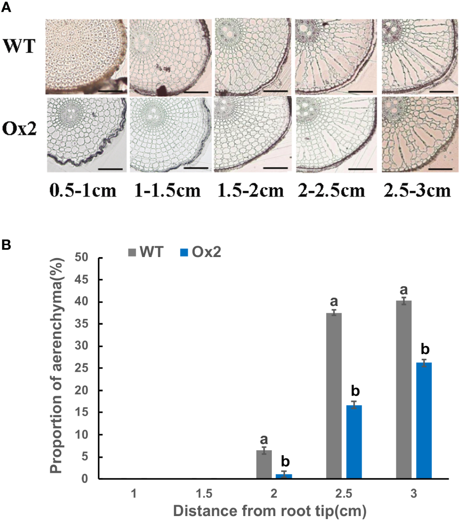 Describe aerenchyma formation in rice roots of WT and Ox2. Figure a-b show resin sections results of roots and aerenchyma formation (%) 0-0.5 cm, 0.5-1.0 cm, 1.0–1.5 cm, 1.5–2.0 cm and 2.0-2.5 cm from root apex in WT and Ox2 and significant difference between WT and Ox2 in each group are indicated by different letters: a= high value, b= lower value. Aerenchyma pics scale bar: 200um, Error bars: SE (n = 3) (t-test, p< 0.05).