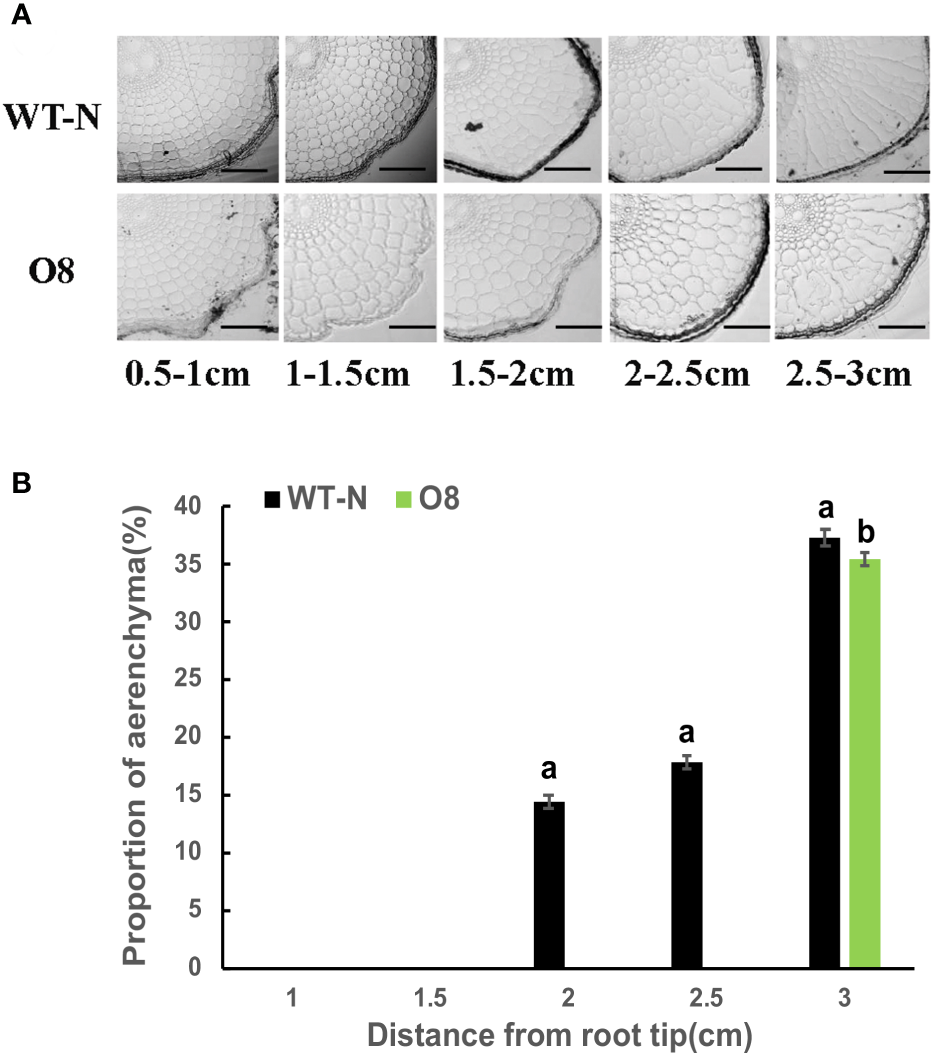 Describe aerenchyma formation in rice roots of WT and O8. Figures (A, B) show resin sections results of roots and aerenchyma formation (%) 0-0.5 cm, 0.5-1.0 cm, 1.0–1.5 cm, 1.5–2.0 cm and 2.0-2.5 cm from root apex in WT and O8 and significant difference between WT and O8 in each group are indicated by different letters: a= high value, b= lower value. Aerenchyma pics scale bar: 200um, Error bars: SE (n = 3) (t-test, p< 0.05).