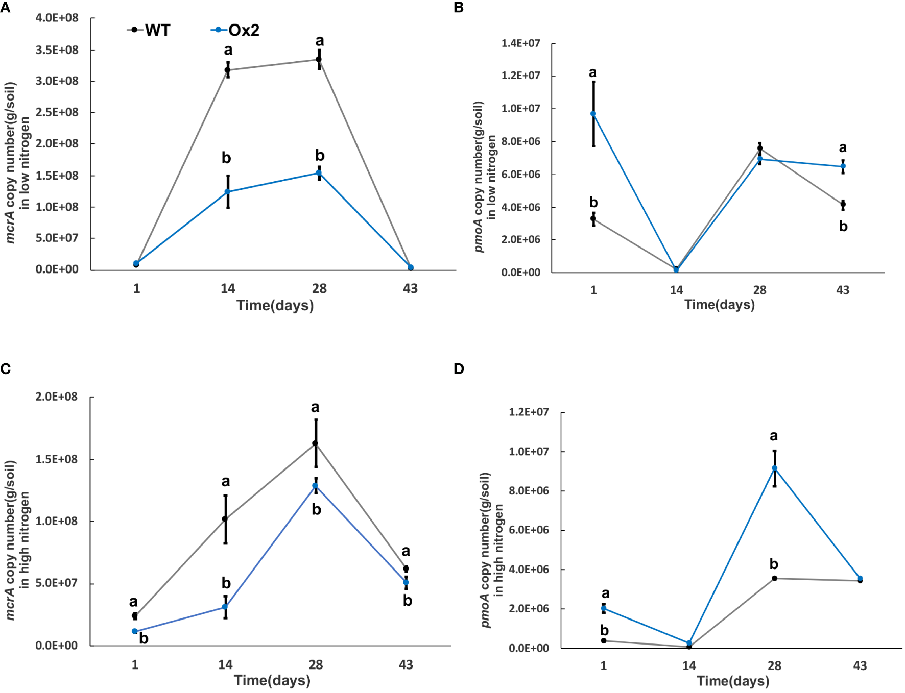 The abundance of mcrA and pmoA genes in low and high Nitrogen soil of WT and Ox2. X-axis shows the soil sampling time (days), from the first measurement after transplanting seedlings from nursery to field. Figures (A, C) show the mcrA copy number/g of soil. Figures (B, D) show the pmoA copy number/g of soil. Error bars: SE (n = 3). Significant difference between WT and Ox2 are indicated by different letters: a= high value, b= lower value (t-test, p< 0.05).