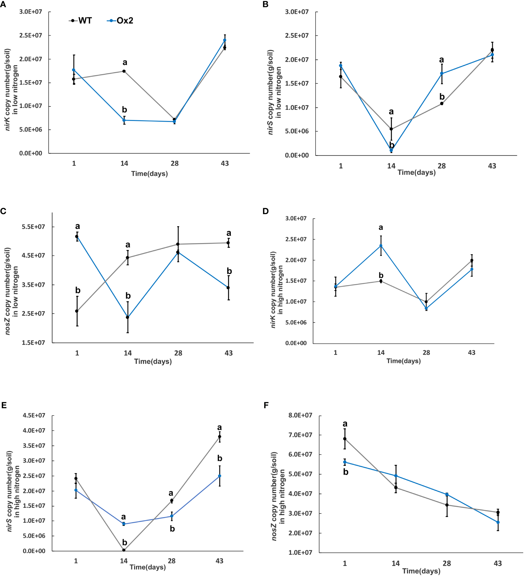 The abundance of nirK, nirS and nosZ genes in low and high Nitrogen soil of WT and Ox2. X-axis shows the soil sampling time (days), from the first measurement after transplanting seedlings from nursery to field, Figures (A, D) show the nirK copy number/g of soil in low and high nitrogen application. Figures (B, E) show the nirS copy number/g of soil in low and high nitrogen application. Figures (C, F) show the nosZ copy number/g of soil in low and high nitrogen application Error bars: SE (n = 3). Significant difference between WT and Ox2 are indicated by different letters: a= high value, b= lower value (t-test, p< 0.05).