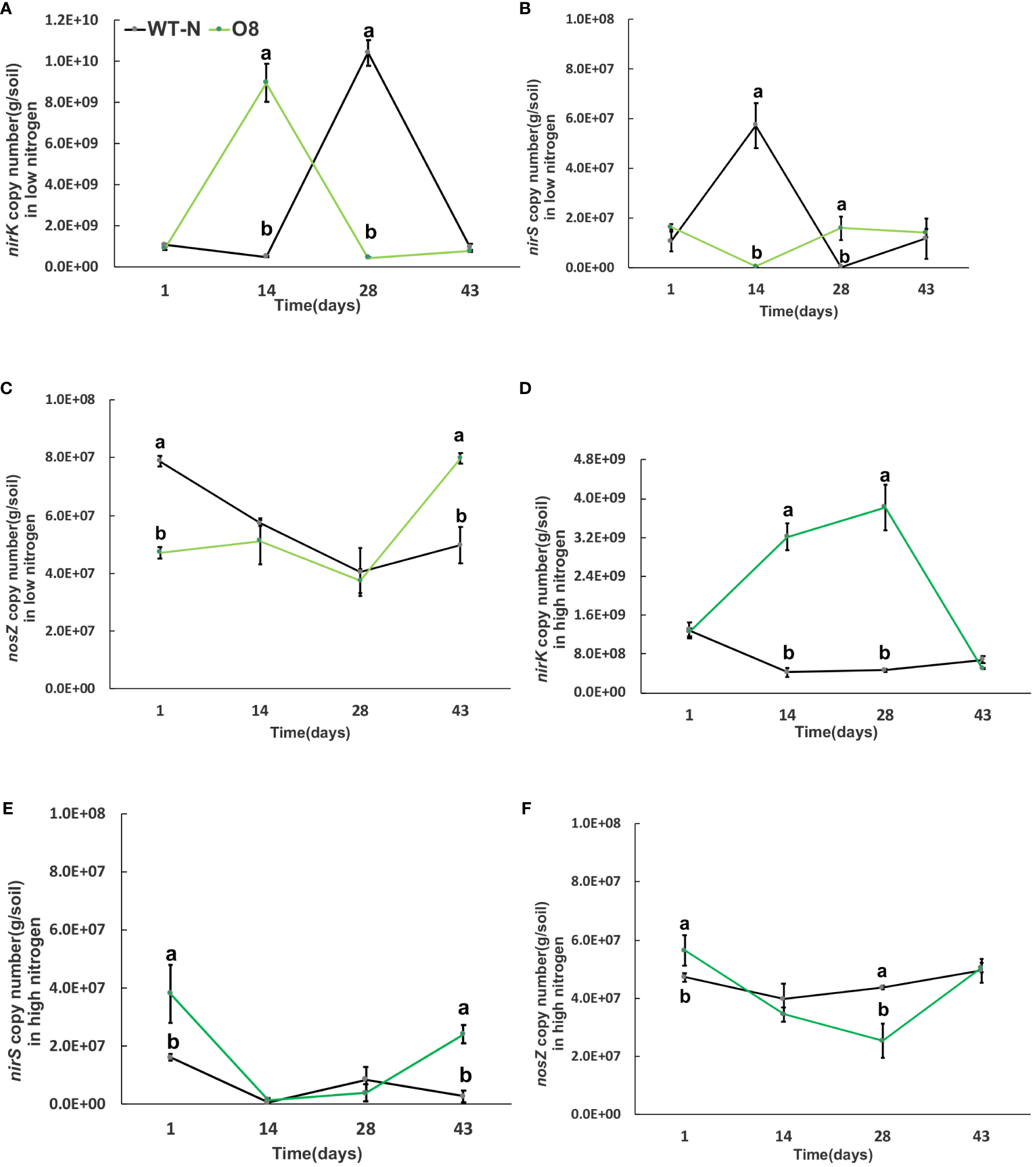 The abundance of nirK, nirS and nosZ genes in low and high Nitrogen soil of WT-N and O8. X-axis shows the soil sampling time (days), from the first measurement after transplanting seedlings from nursery to field. Figures (A, D) show the nirK copy number/g of soil in low and high nitrogen application. Figures (B, E) show the nirS copy number/g of soil in low and high nitrogen application. Figures (C, F) show the nosZ copy number/g of soil in low and high nitrogen application Error bars: SE (n = 3). Significant difference between WT and O8 are indicated by different letters: a= high value, b= lower value (t-test, p< 0.05).