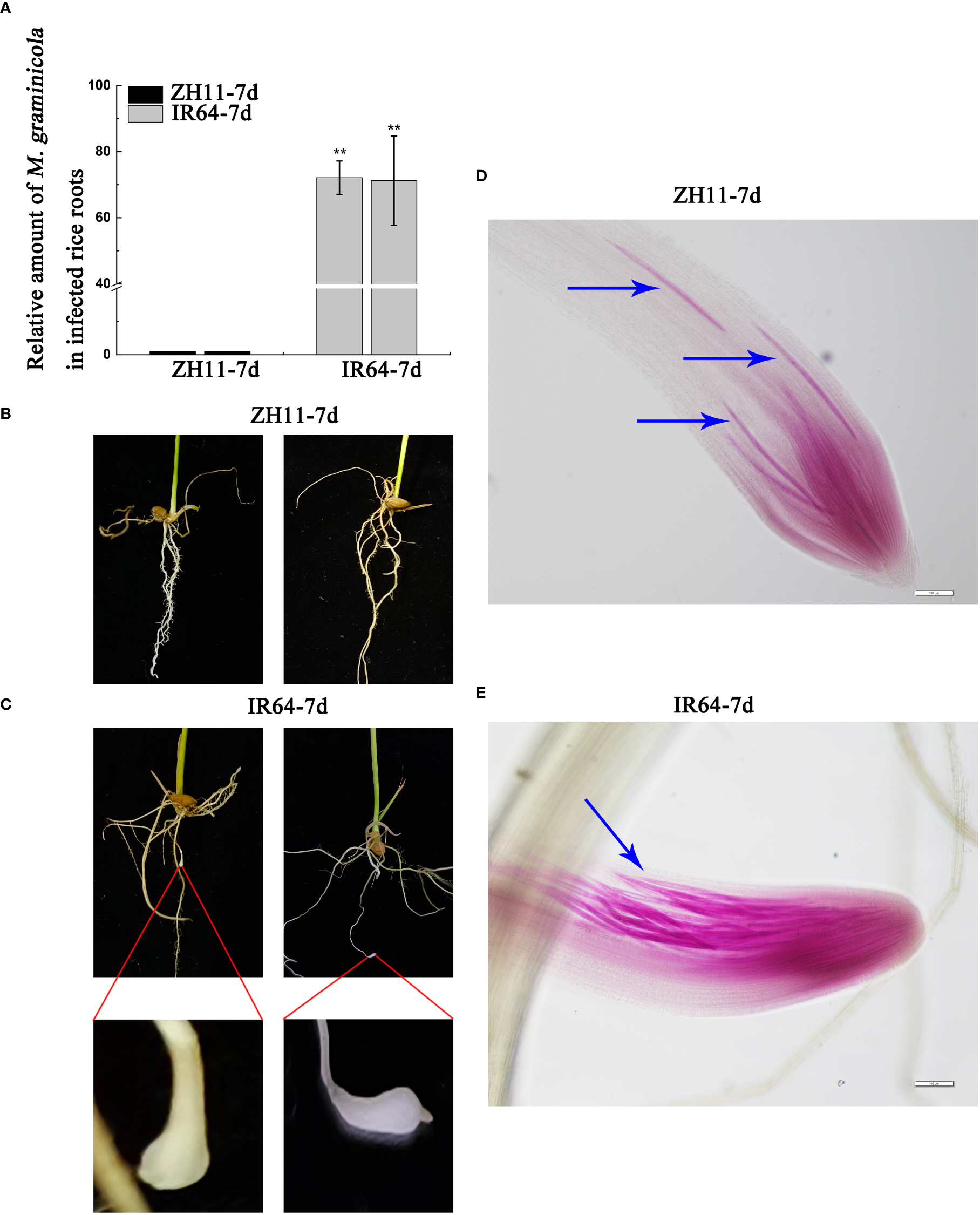 The relative amount of M. graminicola in infected roots of ZH11 and IR64. (A) shows the RT-qPCR results of the amount of M. graminicola in the infected roots of ZH11 and IR64. (B, C) show M. graminicola infection after 7 days; the roots of ZH11 had no root knots, but the roots of IR64 produced root knots, which were enlarged for the clarity of the display. (D, E) show that the roots of ZH11 and IR64 are infected by M. graminicola.