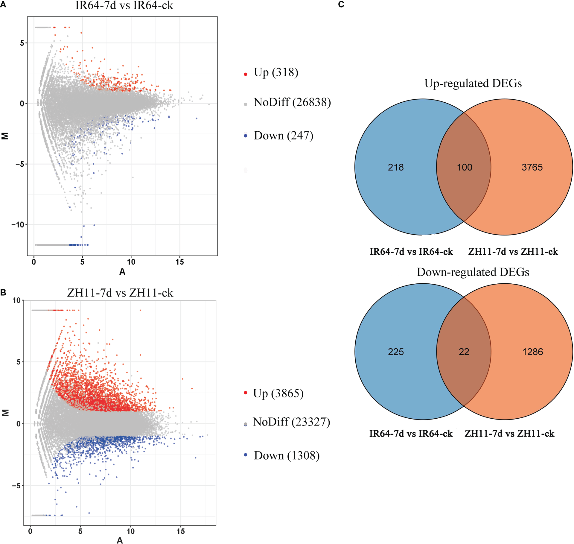 Analysis of transcriptome data from the rice roots for four groups: IR64-ck, IR64-7d, ZH11-ck, and ZH11-7d. (A) MA plots for pairwise expression analysis of transcriptome data of rice roots between IR64-ck and IR64-7d; (B) MA plots for pairwise expression analysis of transcriptome data of rice roots between ZH11-ck and ZH11-7d; (C) Venn diagram showing the upregulated DEGs and downregulated DEGs in comparison groups ZH11-7d vs ZH11-ck and IR64-7d vs IR64-ck.