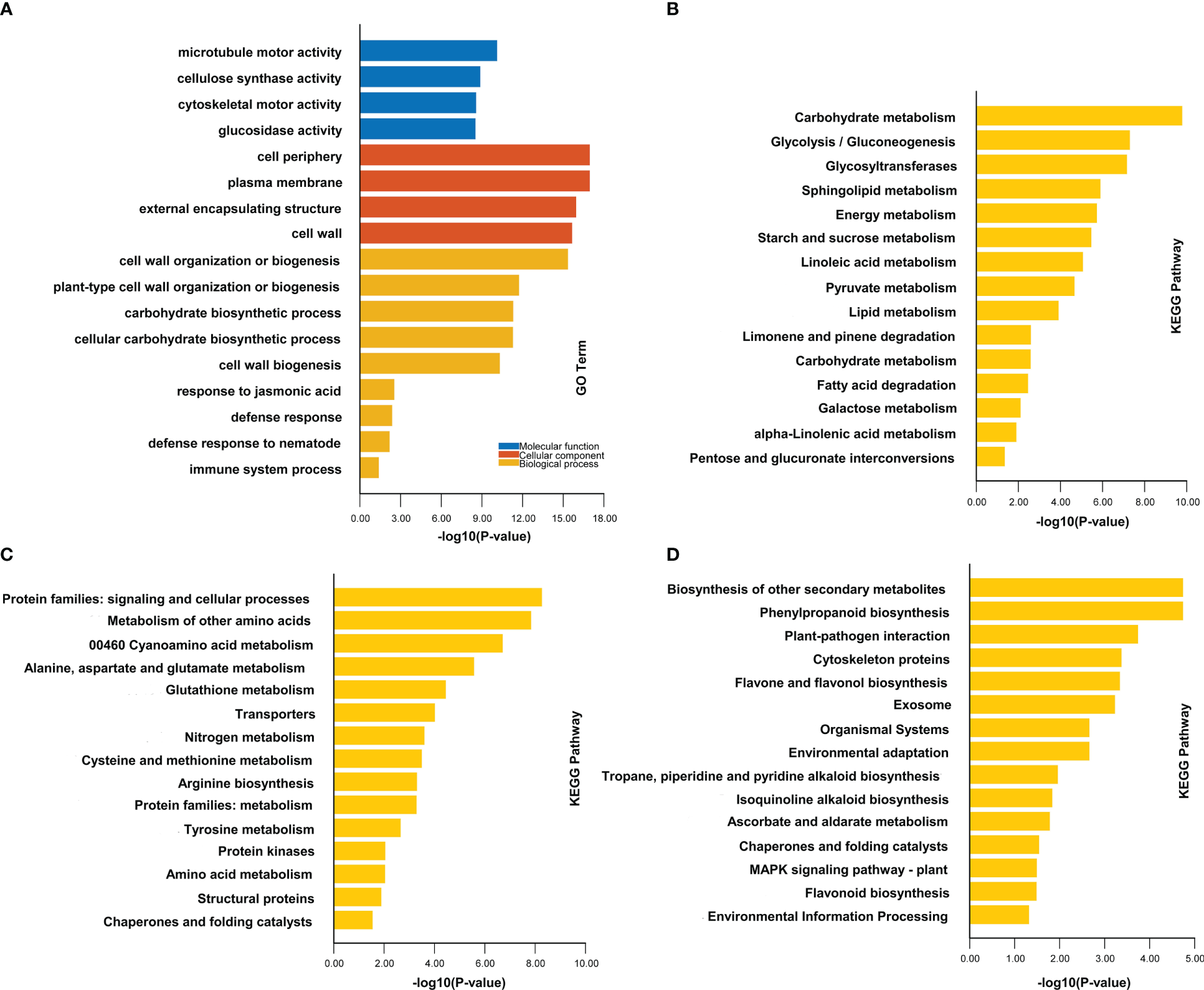 To understand the mechanism of rice resistance to M. graminicola infection, we used GO and KEGG analysis to make an in-depth functional exploration of these DEGs (Table S2, Sheets 6–10). In the comparison group ZH11-7d vs ZH11-ck, 3,765 unique upregulated genes may be related to the disease resistance against M. graminicola infection. Therefore, we analyzed the function of these upregulated genes. The results of GO enrichment of upregulated DEGs suggest that these genes are mainly involved in cell wall biosynthesis, such as cell wall organization or biogenesis (GO:0071554), plant-type cell wall organization or biogenesis (GO:0071669) and cell wall biogenesis (GO:0042546). Additionally, genes enriched in the carbohydrate biosynthetic process (GO:0016051) and cellular carbohydrate biosynthetic process (GO:0034637) are also related to the cell wall synthetic process because a lot of carbohydrates are required for cell wall synthesis. Moreover, genes related to disease resistance were enriched in responses to jasmonic acid (GO:0009753), defense response (GO:0006952), and immune system processes (GO:0002376) (Figure 3A, Table S2, Sheet 9). Accordingly, we found that KEGG enrichment was mainly in three aspects. The first one was carbohydrate metabolism, which was directly related to the synthesis of carbohydrate compounds such as cellulose, hemicellulose, and pectin in plant cell walls. The second aspect was amino acid metabolism, which worked together with the third aspect of the plant resistance pathway, participating in plant secondary metabolic processes such as phenylpropanoid biosynthesis (ko00940), flavonoids metabolism (ko00941 and ko00944), and plant signal transduction processes such as protein kinases (ko01001), MAPK pathway (ko04016), and plant pathogen interaction process (ko04626) (Figures 3B–D, Table S3, Sheet 3). These three aspects greatly improved the resistance of ZH11 and effectively resisted the infection of nematodes.