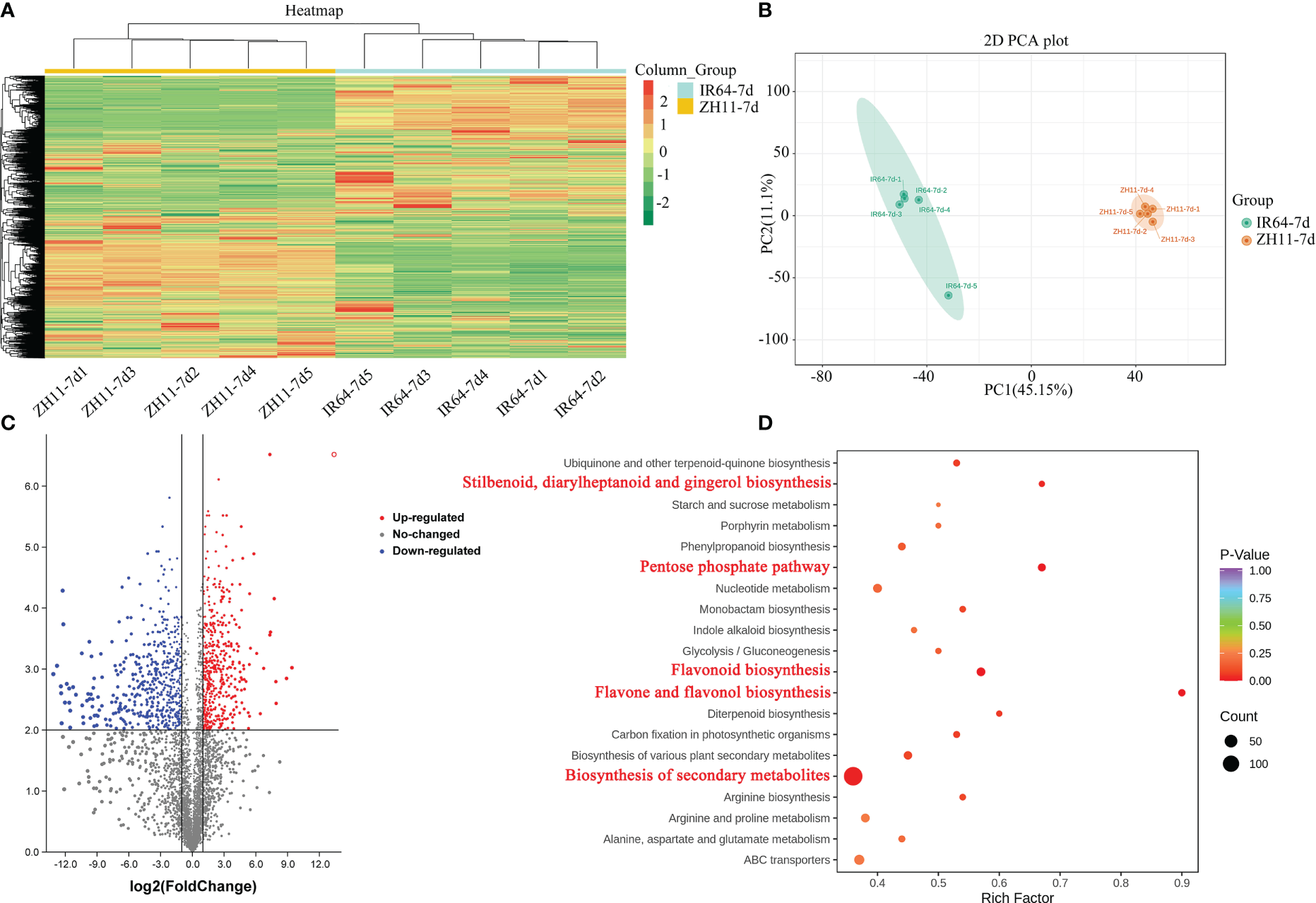 After conducting quantitative analyses on all the detected metabolites and applying a fold change threshold, a total of 1,687 DAMs were identified between IR64-7d and ZH11-7d. Of these, 810 metabolites were upregulated in ZH11-7d, while 877 metabolites were downregulated (Figure 4C, Table S3, Sheet 6). Further analysis enabled the identification of 253 of these metabolites (Table S3, Sheet 7). According to KEGG enrichment analysis, it was found that the DAMs identified in ZH11-7d were mainly enriched in five pathways as compared to IR64-7d. These pathways include biosynthesis of secondary metabolites (ko01110), flavone and flavonol biosynthesis (ko00944), flavonoid biosynthesis (ko00941), the pentose phosphate pathway (ko00030), and stilbenoid, diarylheptanoid, and gingerol biosynthesis (ko00945) (P-value <0.05) (Figure 4D, Table S3, Sheet 8).