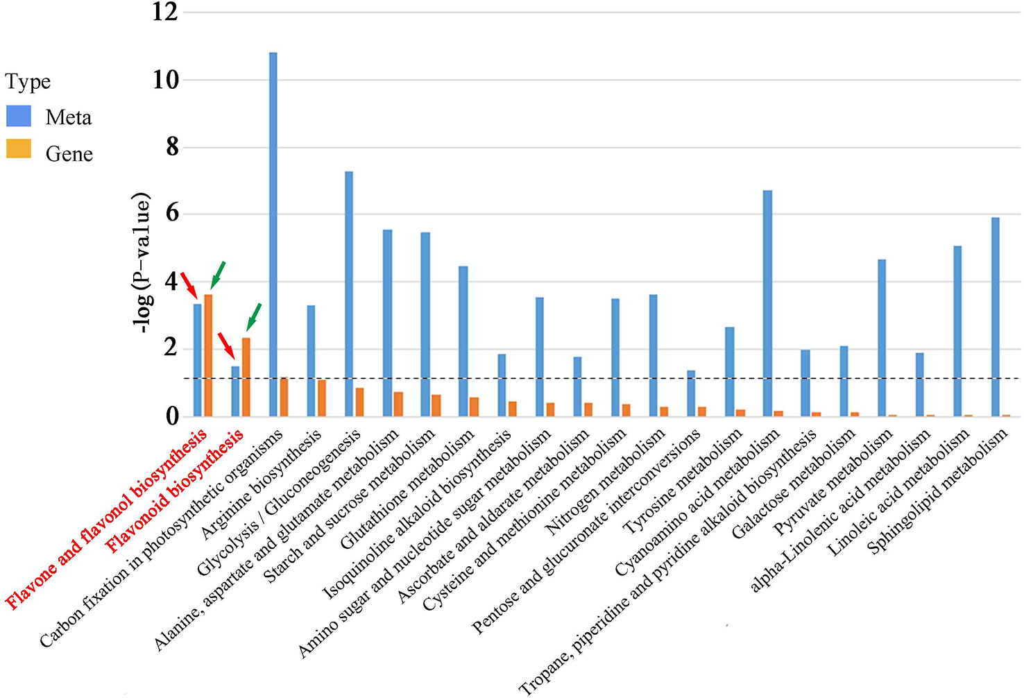 DEG and DAM enrichment in KEGG pathways. A P-value was calculated by a hypergeometric test, which indicates the degree of enrichment of DEGs or DAMs. The red arrow indicates metabolites enriched in flavone and flavonol biosynthesis (ko00944) and flavonoid biosynthesis (ko00941), and the green arrow indicates genes enriched in flavone and flavonol biosynthesis (ko00944) and flavonoid biosynthesis (ko00941). The dotted line indicates the size or column height when the p-value is 0.05.