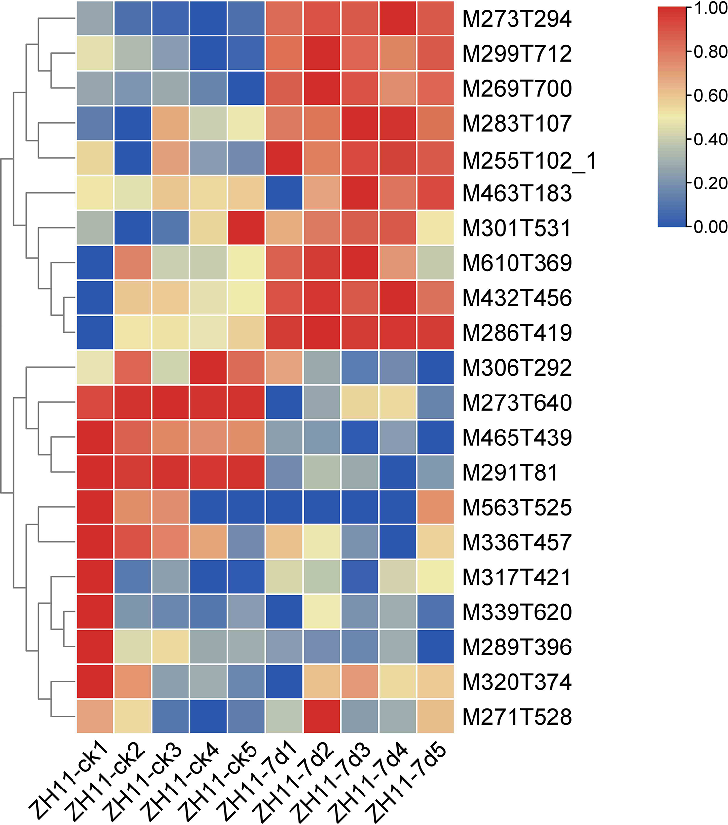 The heatmap shows the content of compounds involved in flavonoids metabolism in healthy roots (ZH11-ck) and infected roots (ZH11-7d) of rice ZH11. Metabolites with increased content during nematode infection were M273T294 (Apiforol), M299T712 (Kaempferide), M269T700 (Apigenin), M283T107 (Quercetin), M255T102_1 ((S)-Pinocembrin), M463T183 (Isoquercitrin), M301T531 (Hesperetin), M610T369 (Rutin), M432T456 (Apigenin 7-O-beta-D-glucoside), M286T419 (Kaempferol). In different samples, the metabolic compounds showed similar states for Pearson clustering.