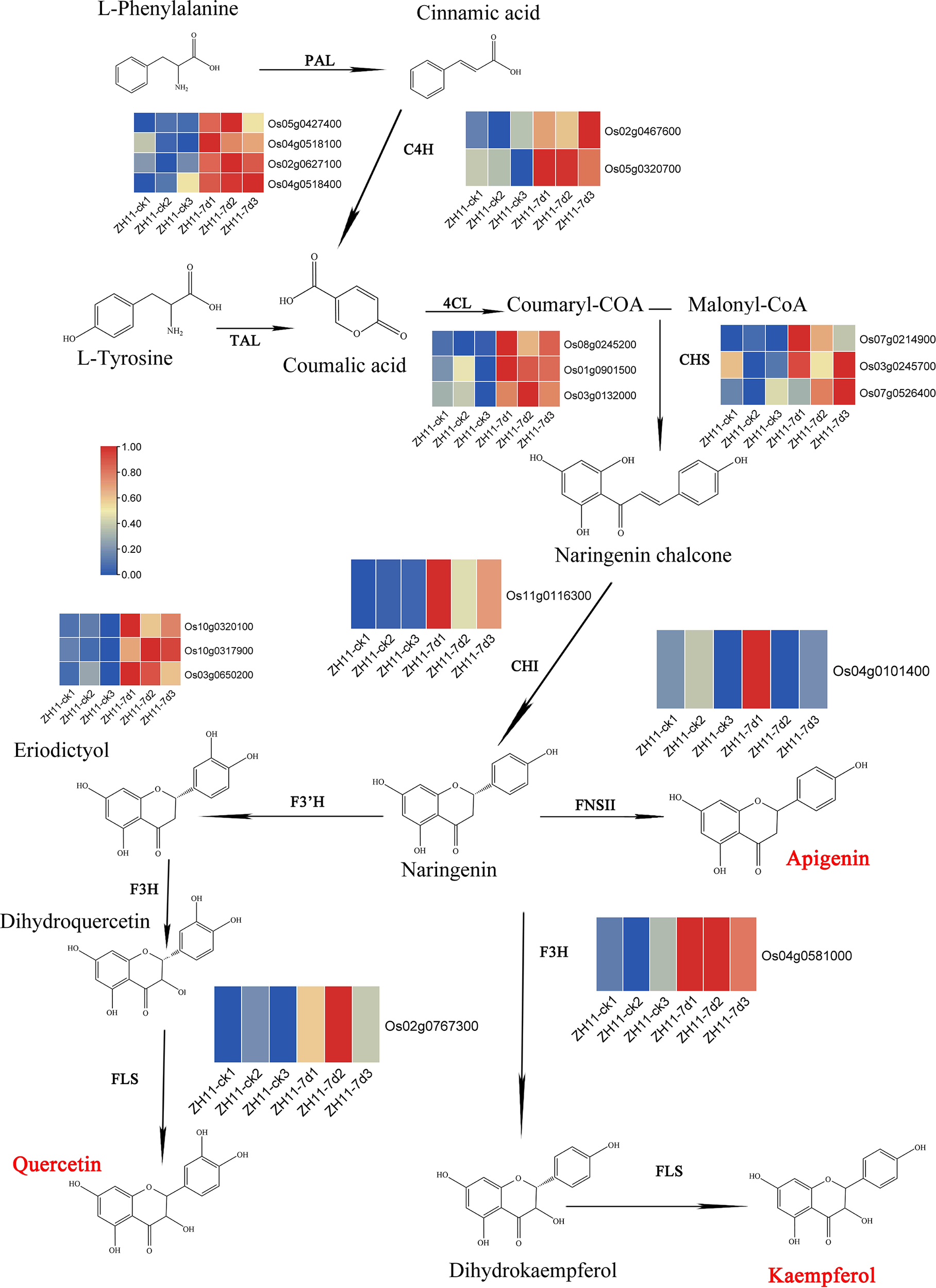The metabolic pathway of flavonoids and the expression heatmap of the genes involved in this pathway from O. sativa infected by M. graminicola. PAL: phenylalanine ammonia lyase (Os05g0427400, Os04g0518100, Os02g0627100 and Os04g0518400); C4H: cinnamate 4 hydroxylase (Os02g0467600 and Os05g0320700); TAL: tyrosine ammonia lyase; 4CL: coumaric acid COA ligase (Os08g0245200, Os01g0901500 and Os03g0132000); CHS: chalcone synthetase (Os07g0214900, Os03g0245700 and Os07g0526400); CHI: chalcone isomerase (Os11g0116300); FNSII: flavone synthase II (Os04g0101400); F3’H: flavonoid3’-hydroxylasc (Os10g0320100, Os10g0317900 and Os03g0650200); F3H: flavanone-3-hydroxylase (Os04g0581000); FLS: flavonol synthase (Os02g0767300).