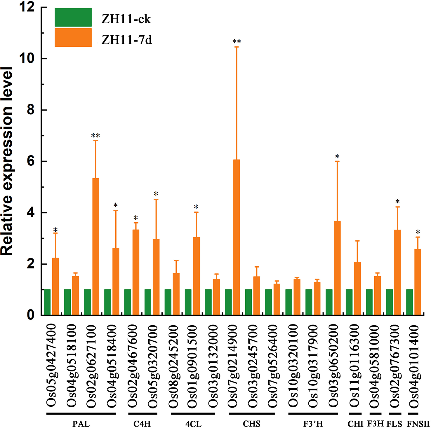 The relative expression of genes involved in the flavonoid biosynthesis in ZH11 roots infected by M. graminicola. Expression level was measured by RT-qPCR and the means ± SE from three independent tests were calculated. Asterisks represent significant differences for the defense-related genes using Duncan’s test. (*p <0.05, **p <0.01).
