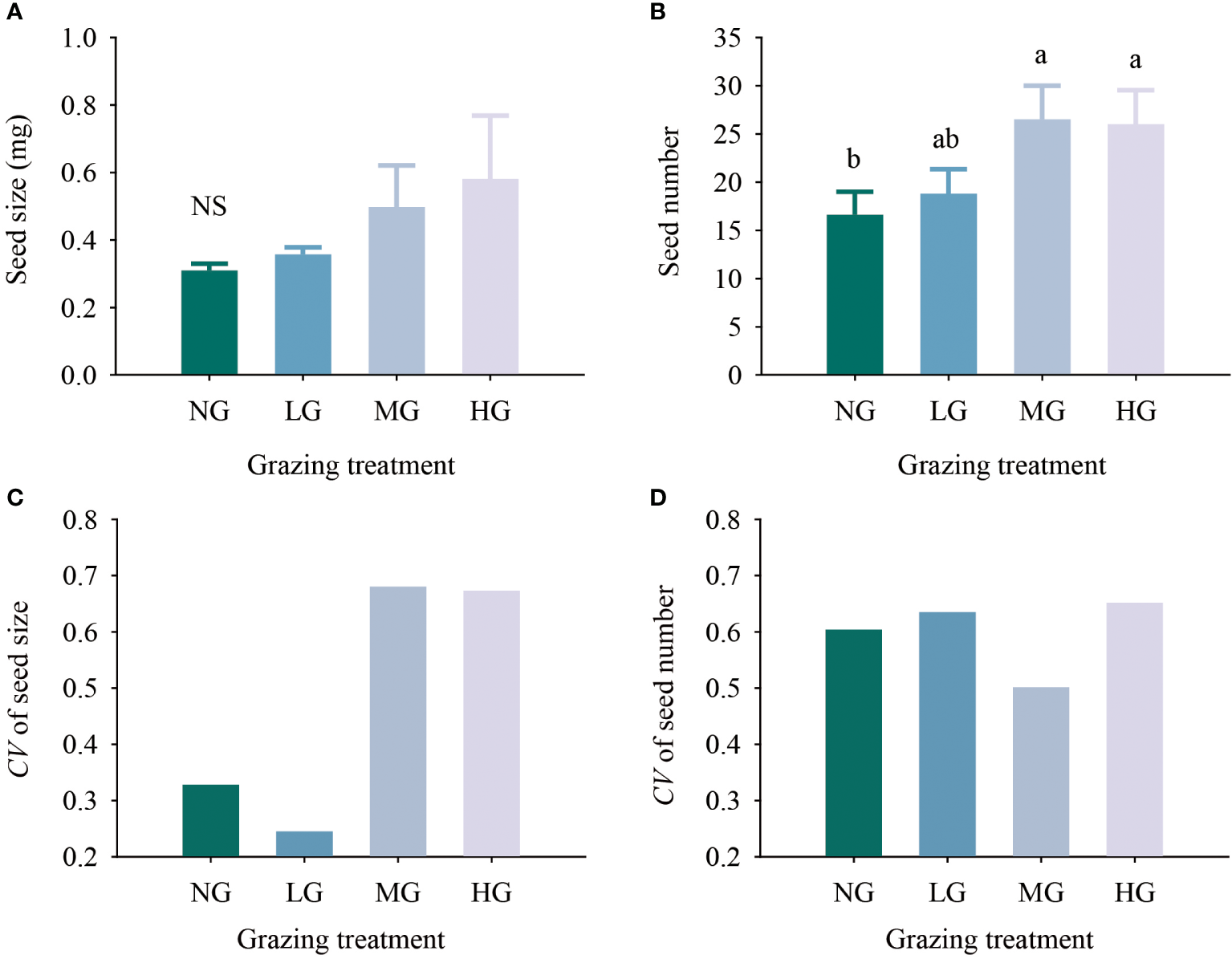 Effects of different grazing treatments on seed size (A), seed number (B), seed size variation coefficient (C) and seed number variation coefficient (D) of Kobresia humilis in alpine grassland (mean ± standard error). NG, no grazing; LG, light grazing; MG, moderate grazing; HG, heavy grazing. Different lowercase letters indicate significant differences between different grazing treatments (P< 0.05), and NS indicates no difference between treatments.