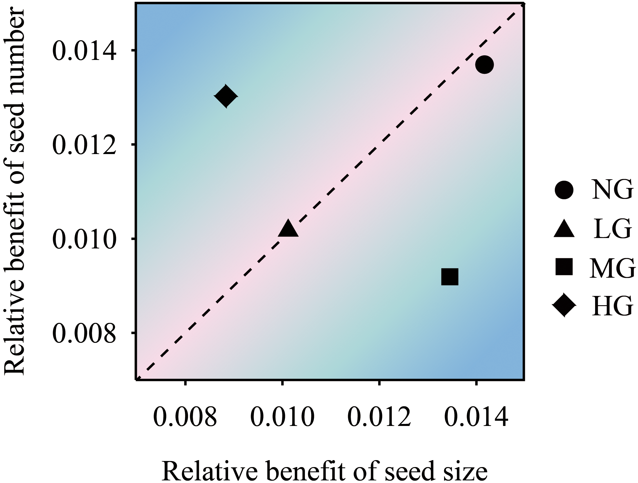 The trade-off relationship between K. humilis seed number and seed size under different grazing treatments. NG, no grazing; LG, light grazing; MG, moderate grazing; HG, heavy grazing.