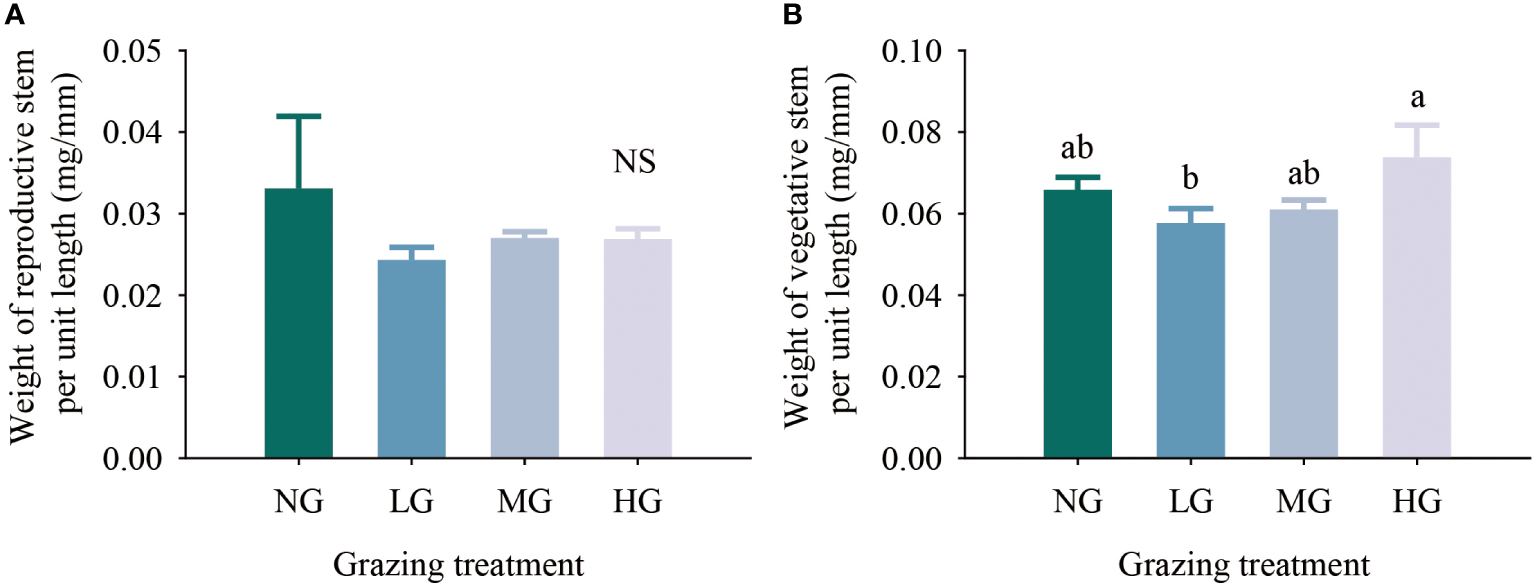 Effects of different grazing treatments on reproductive stem resource input (A) and vegetative stem resource input (B) of Kobresia humilis in alpine grassland (mean ± standard error). NG, no grazing; LG, light grazing; MG, moderate grazing; HG, heavy grazing. Different lowercase letters indicate significant differences between different grazing treatments (P< 0.05), and NS indicates no difference between treatments.