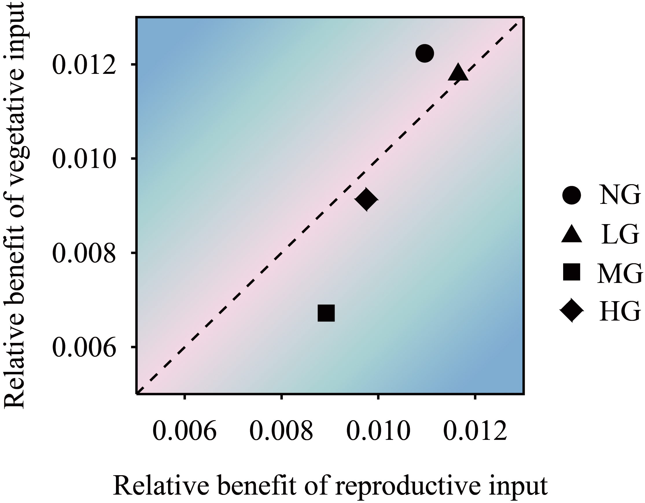 The trade-off relationship between K. humilis reproductive and vegetative stem resource inputs of under different grazing treatments. NG, no grazing; LG, light grazing; MG, moderate grazing; HG, heavy grazing.
