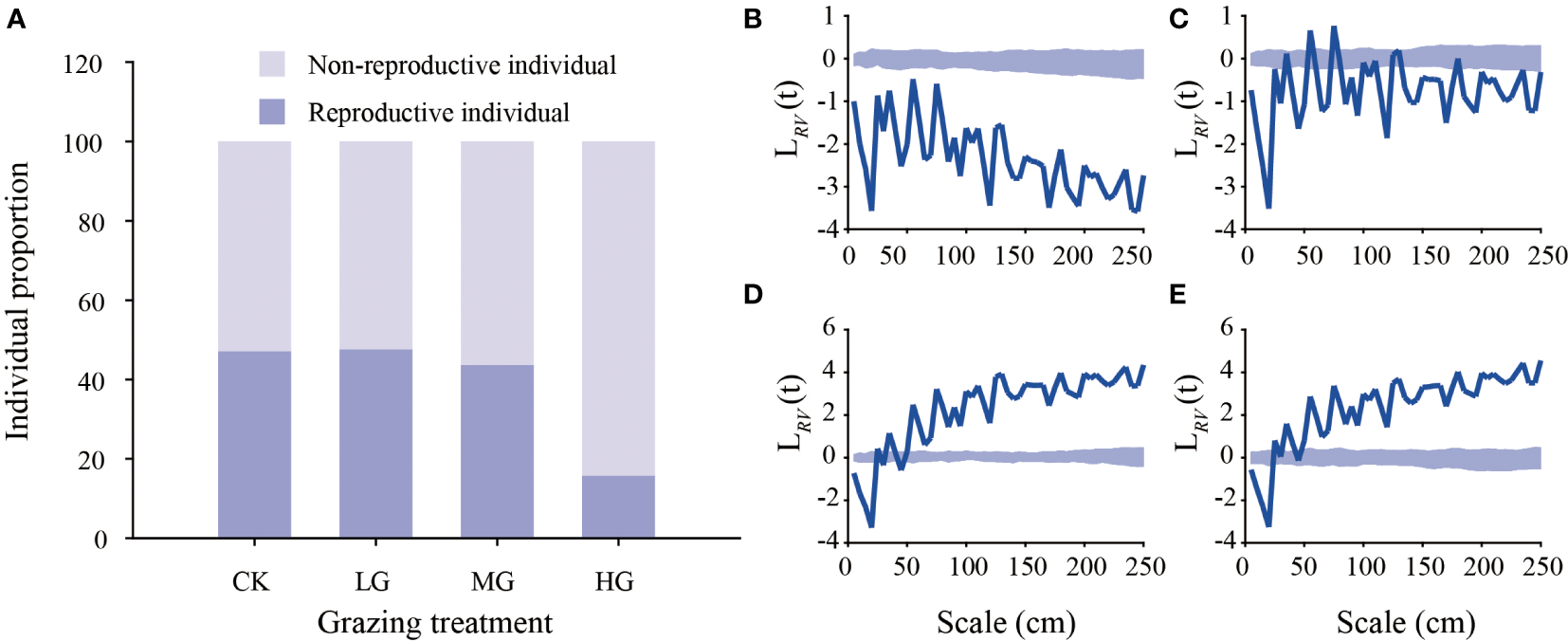 Proportion of reproductive and nonreproductive Kobresia humilis individuals under different grazing treatments (A) and point pattern analysis of reproductive and nonreproductive Kobresia humilis individuals under different grazing treatments. The thick blue line represents the measured value, and the shaded area represents the upper and lower confidence intervals. When the thick blue line is located above the confidence interval, the nonreproductive and reproductive individuals are spatially positively correlated. When the thick blue line is located below the confidence interval, the nonreproductive and reproductive individuals are spatially negatively correlated. No grazing treatment (B), light grazing treatment (C), moderate grazing treatment (D), heavy grazing treatment (E). NG, no grazing; LG, light grazing; MG, moderate grazing; HG, heavy grazing.