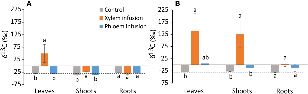 Effects (n = 3 – 5, mean value ± 1 SE) of xylem infusion (orange color) and phloem infusion (blue) with 13C-labelled glucose into Ficus microcarpa bonsai trees compared to controls (grey) under greenhouse conditions (see Figure 1). Samples were taken three (A) and ten (B) weeks after the infusion started. The dashed lines correspond to the average natural 13C abundance (~ -26‰ δ13C) in European trees (Taylor et al., 2003; Zeller et al., 2007). Different lowercase letters indicate significant differences in δ13C values of tissue (i.e., leaves, shoots, or roots) among the treatment xylem infusion, phloem infusion and controls (P < 0.05).