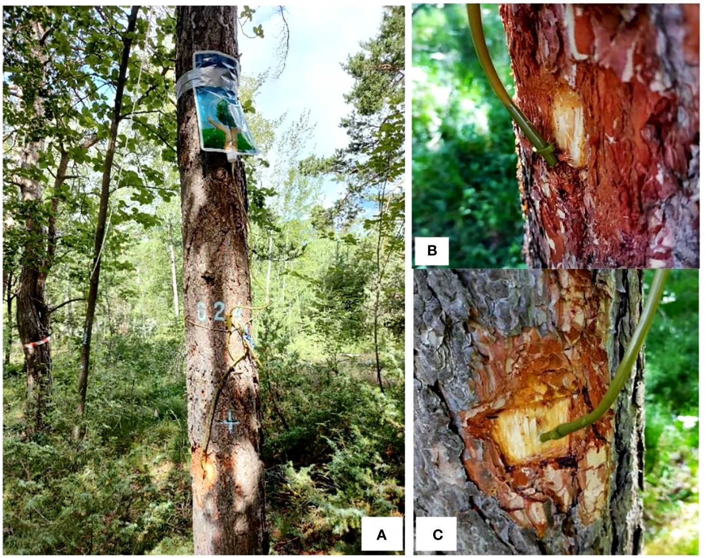 Glucose infusion experiment with adult Scots pine (Pinus sylvestris) trees (A), for phloem infusion (B) and xylem infusion (C) in Pfynwald, Valais, Switzerland. For phloem infusion (B), a hole (~20 mm in depth, and 3.5 mm in diameter) between the bark and xylem, parallel to the stem surface, was drilled with an electric drill, then the thick plastic infusion needle was inserted into that hole. For xylem infusion (C), we also used an electric drill to drill a hole (~20 mm in depth, and 3.5 mm in diameter) in a 45° angle into the stem, and then the thick plastic infusion needle was inserted into that hole.