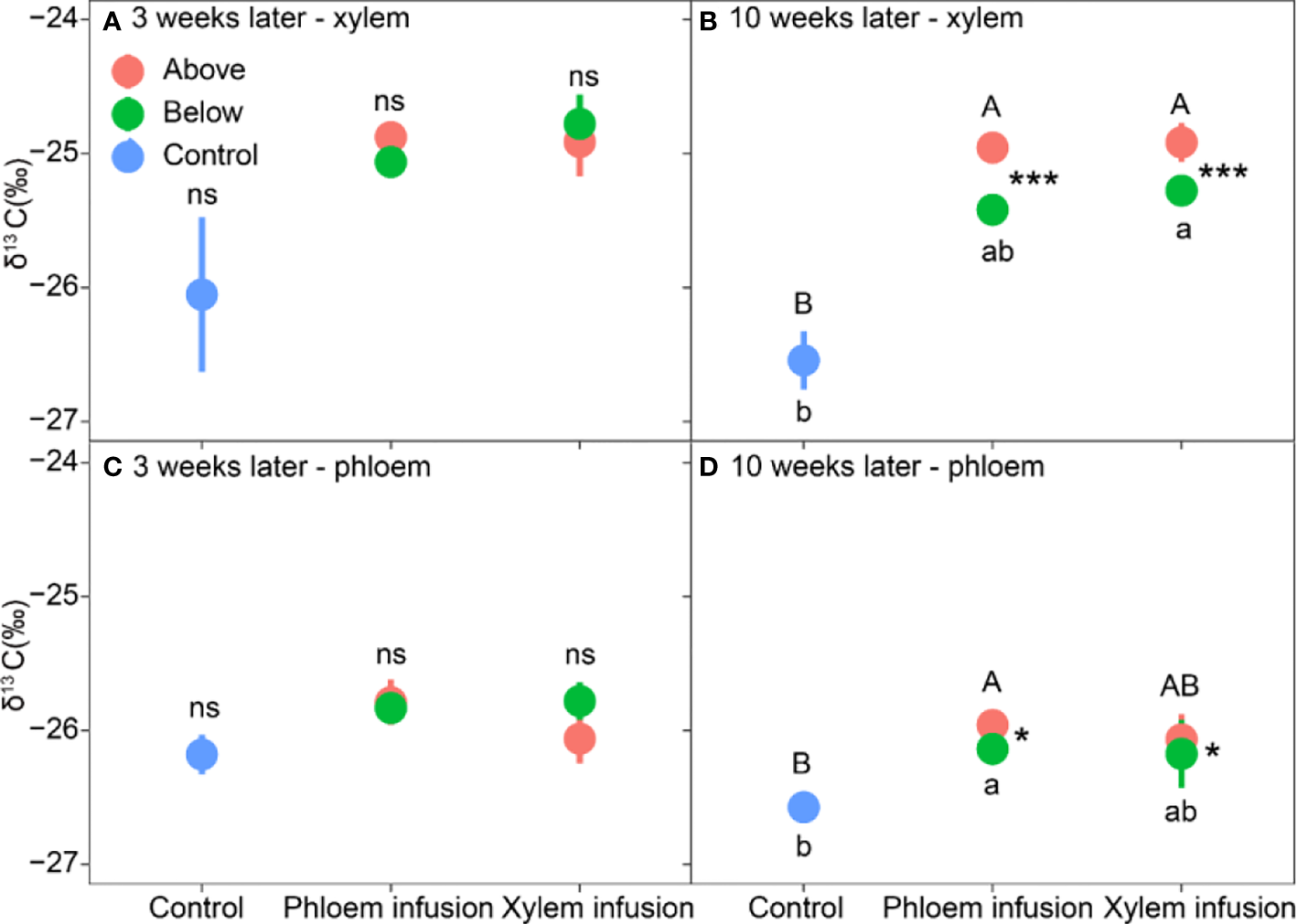 Effects of 13C-labelled glucose infusion into phloem and xylem tissues of adult Pinus sylvestris trees compared to controls (n = 3, mean value ± 1 SE). Tissues were collected from positions above (red color) and below (green) the infusion point at the time of three weeks (A, C; leaf panel) and ten weeks (B, D; right panel) after the infusion started. Note different capital letters indicate significant differences in δ13C values among ‘above’-samples and controls, and different lowercase letters indicate significant differences in δ13C values among ‘below’-samples and controls. * (P < 0.05) and *** (P < 0.001) denote significant differences in δ13C values between ‘above’ and ‘below’-samples within a treatment.