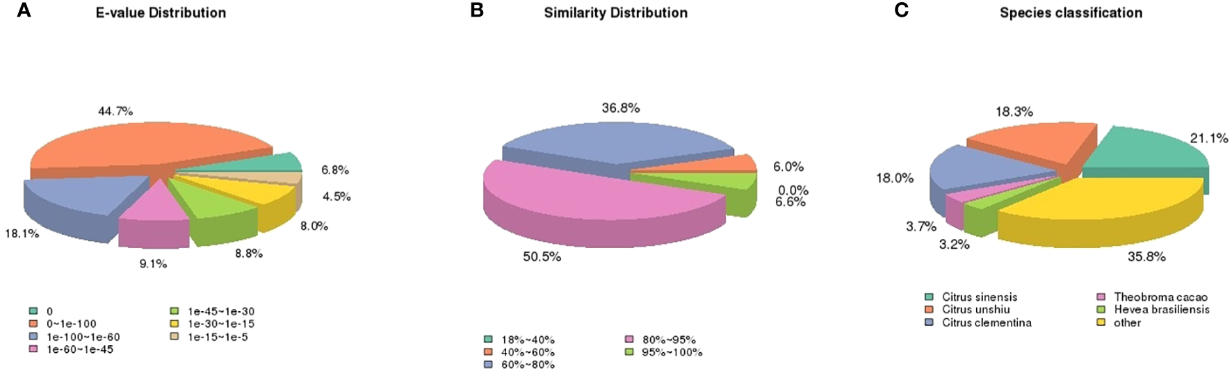 Pie charts showing distribution of the BLASTxmatches of mango transcriptome unigenes against Nr databases. (A) E-values distribution, (B) similarity distribution, and (C) species classification.