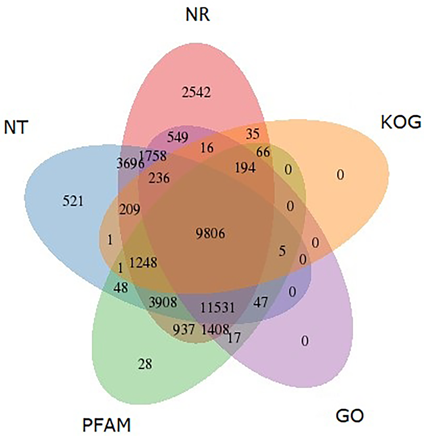 Venn diagram shows the BLAST results of M. indica against five databases, including NT, NR, KOG, GO and PFAM. The number of transcripts with significant hits is presented in each intersection of the Venn diagram.