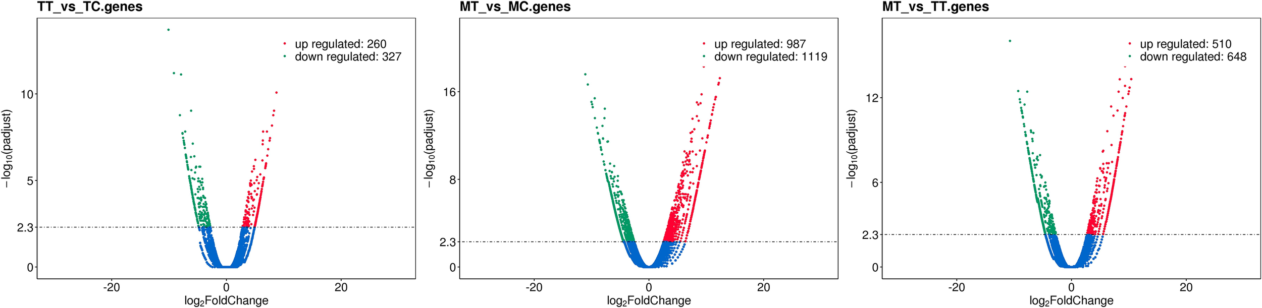 Volcano plots of DEGs in the pairwise comparisons and pathway enrichment. (A) Volcano plot of DEGs in the TT vs. TC comparison. Green dots represent genes upregulated in Turpentine Treated. Red dots represent genes upregulated in Turpentine Control. (B) Volcano plot of DEGs in the MT vs. MC comparison.Green dots represent genes upregulated in Mylepelian Treated. Red dots represent genes upregulated in Mylepelian Control. (C) Volcano plot of DEGs in the MT vs. TT comparison.Green dots represent genes upregulated in Mylepelian Treated. Red dots represent genes upregulated in Turpentine Treated. x-axis: fold change in gene expression between different samples; y-axis: statistical significance of the differences represented by red dots.