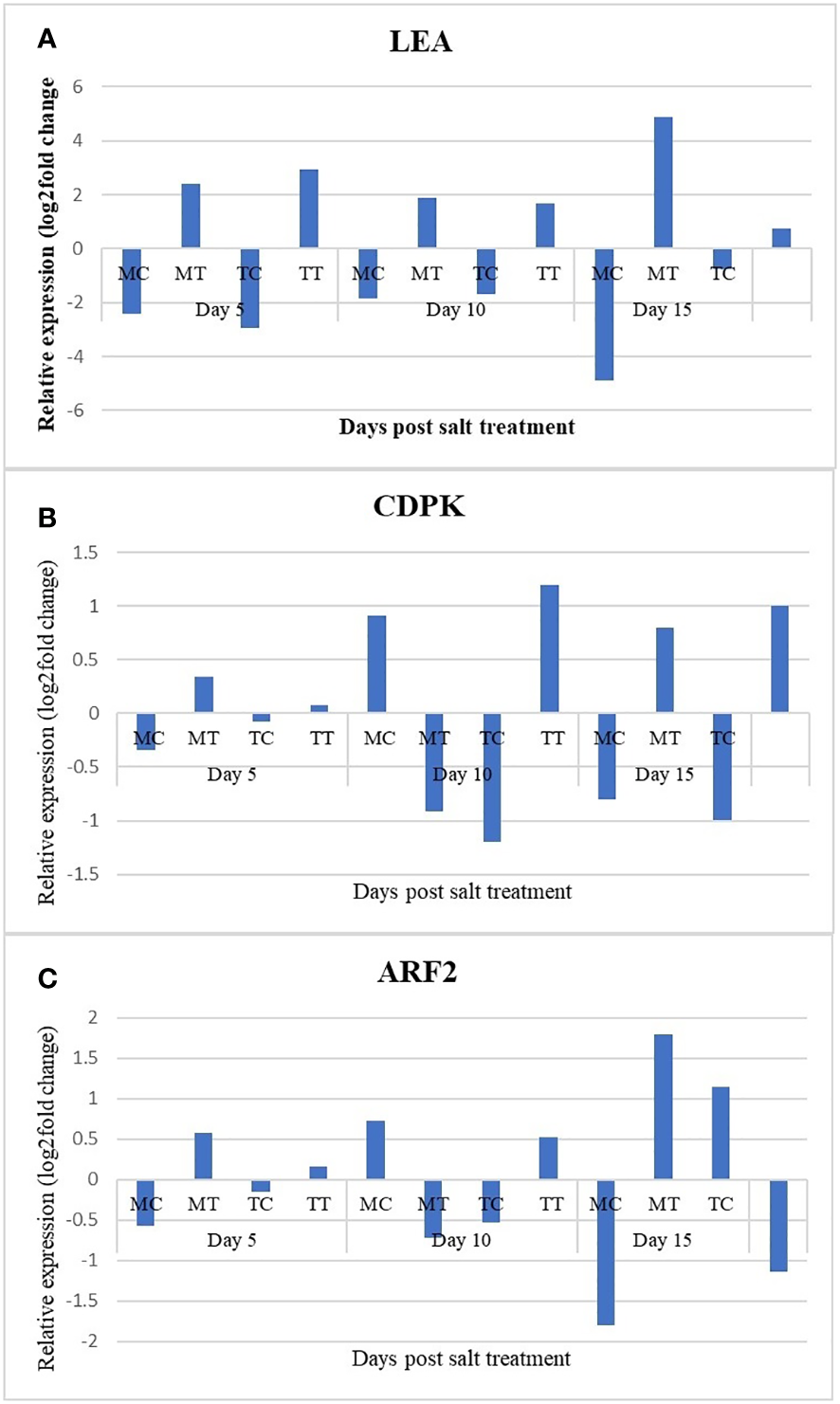 To specifically identify salt responsive differential gene expression in the two mango genotypes, we studied the expression profiles to understand the gene activity changes by comparing between, MT vs. MC, MT vs. TT and TT vs. TT using volcano plots to comprehend the distribution of differentially expressed genes (DEGs) (Figures 5A–C). DEGs with [log2(Fold Change)] > 1 and q-value < 0.005 were assumed to be significantly up or down-regulated in a sample in relation to the other one. Between the samples MT vs. MC, 2106 genes exhibited significant changes in gene expression where 987 genes were found to be up-regulated while 1119 genes were down-regulated (Figure 5). Among the top most up-regulated genes, we detected genes involved in abiotic stress tolerance viz., SKP1-like protein (Arabidopsis thaliana), transcription factors viz., NAC-domain containing protein (A. thaliana), bZIP transcription factor 60 (A. thaliana)and antioxidants viz., Glutathione S-transferase L3 (A. thaliana). While among the top most downregulated genes were the genes involved in photosynthesis and carbohydrate metabolism viz., Photosystem I reaction center subunit IV [Thermosynechococcus elongatus (strain BP-1)], Photosystem II 10 kDa polypeptide (Nicotiana tabacum).