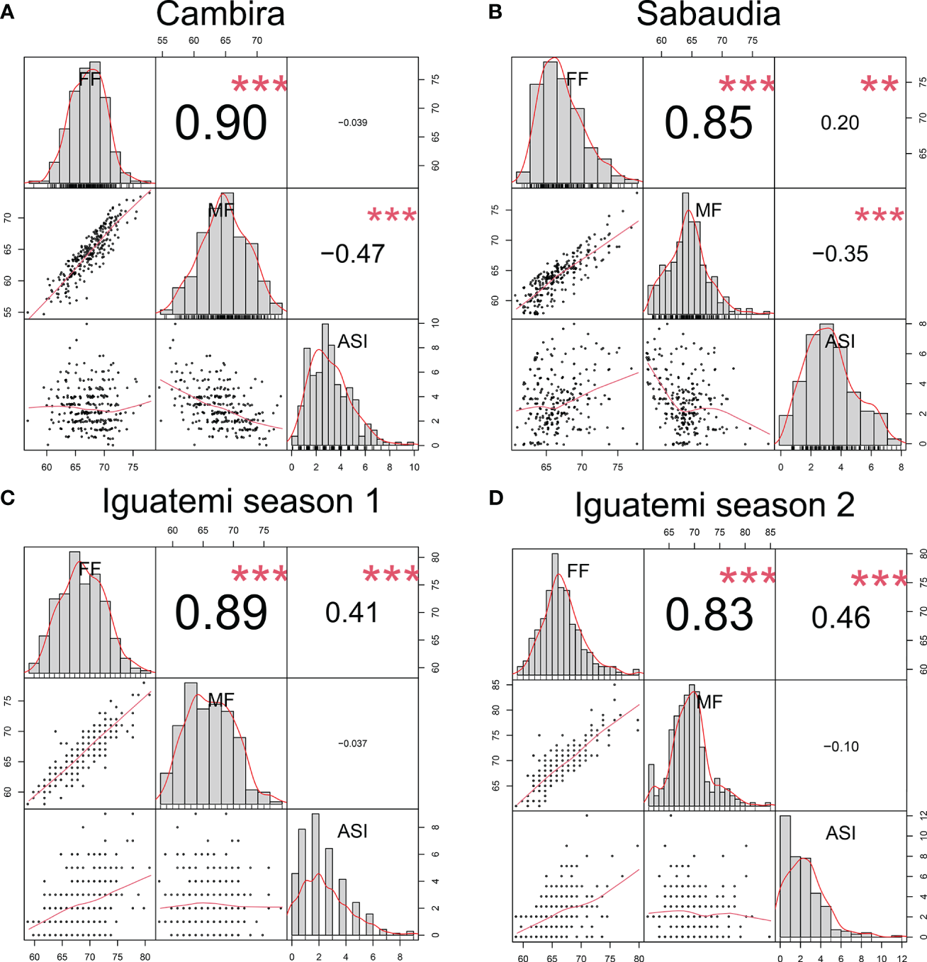 Correlation between flowering traits in the Cambira, Sabaudia, Iguatemi season 1, and Iguatemi season 2 environments (A–D, respectively). The figure illustrates the correlation between female flowering (FF), male flowering (FM), and anthesis-silking interval (ASI) in the four different environments. The diagonal of the plot displays histograms and distributions of the observed phenotype values, while the lower off-diagonal presents scatter plots between the traits. Significance levels of the correlation coefficients are indicated by ** for p< 0.01, and *** for p< 0.001.